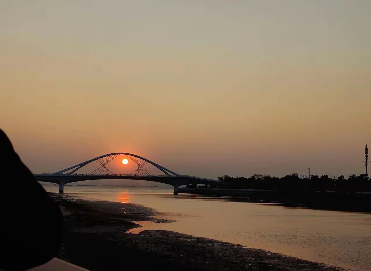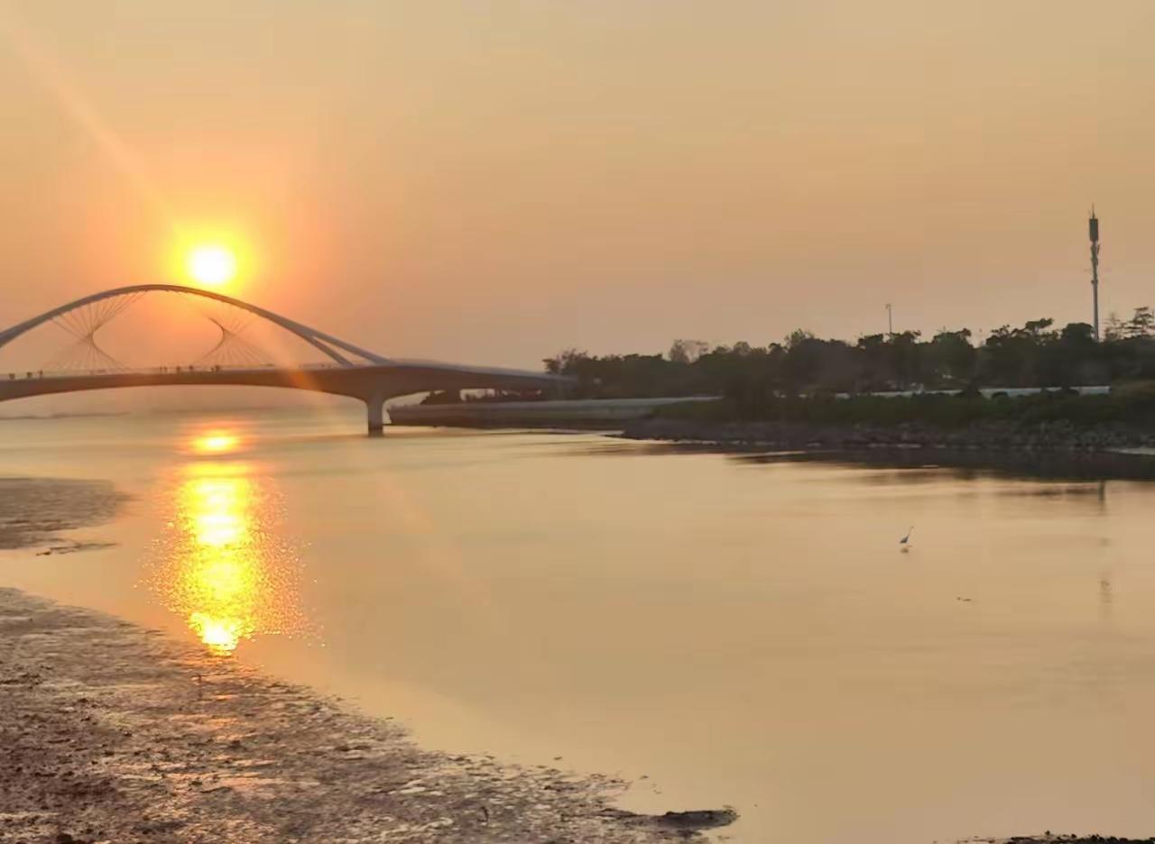 夕阳无限好,只是近黄昏 夕阳西下,滨海湾风景好美,已经成为很多人的打卡地。看一场桥与落日的约会,把烦恼都丢进这温柔的橘色海。 桥下的水面被落日染成金橙色,波光粼粼的光斑随波晃动,像撒了一河碎金,桥面上隐约的人影更添了几分生活的烟火气。