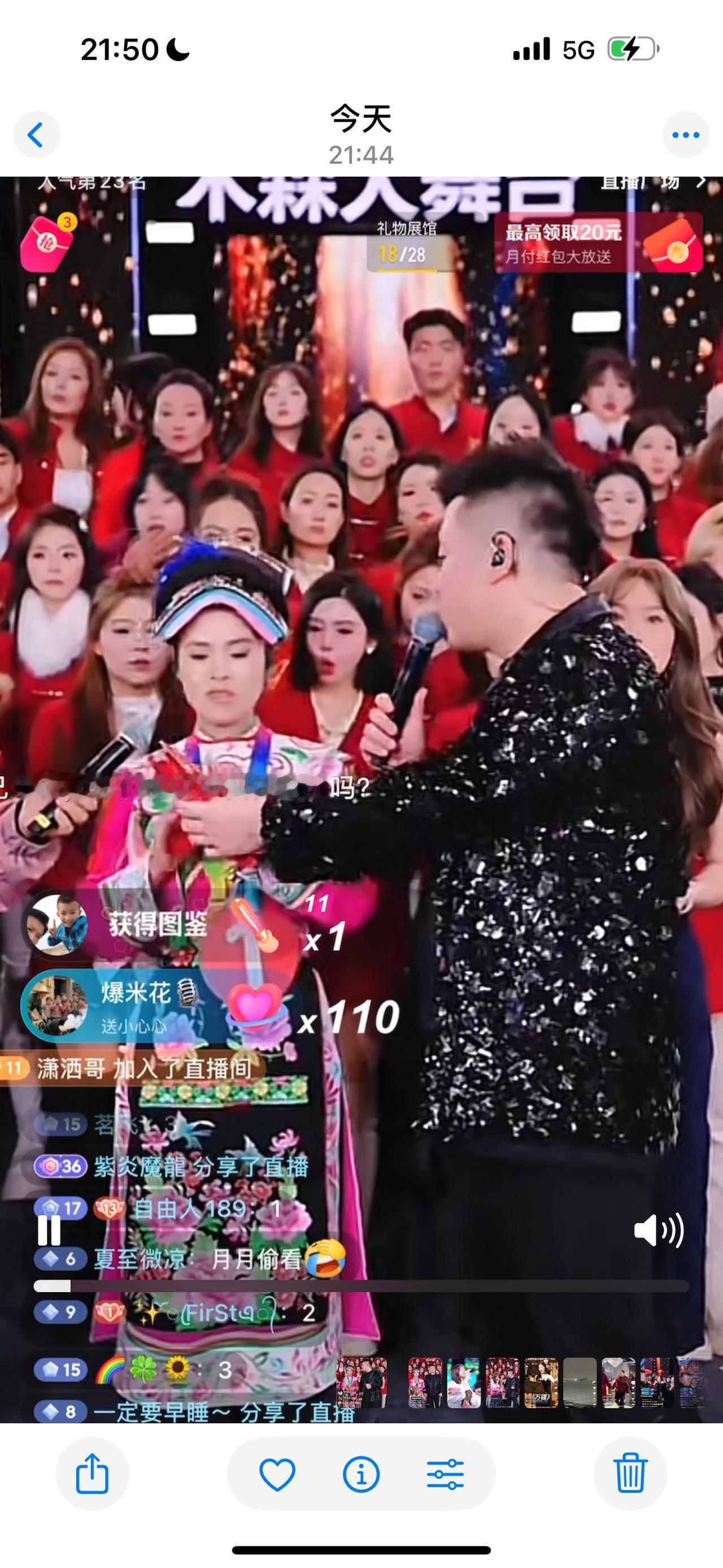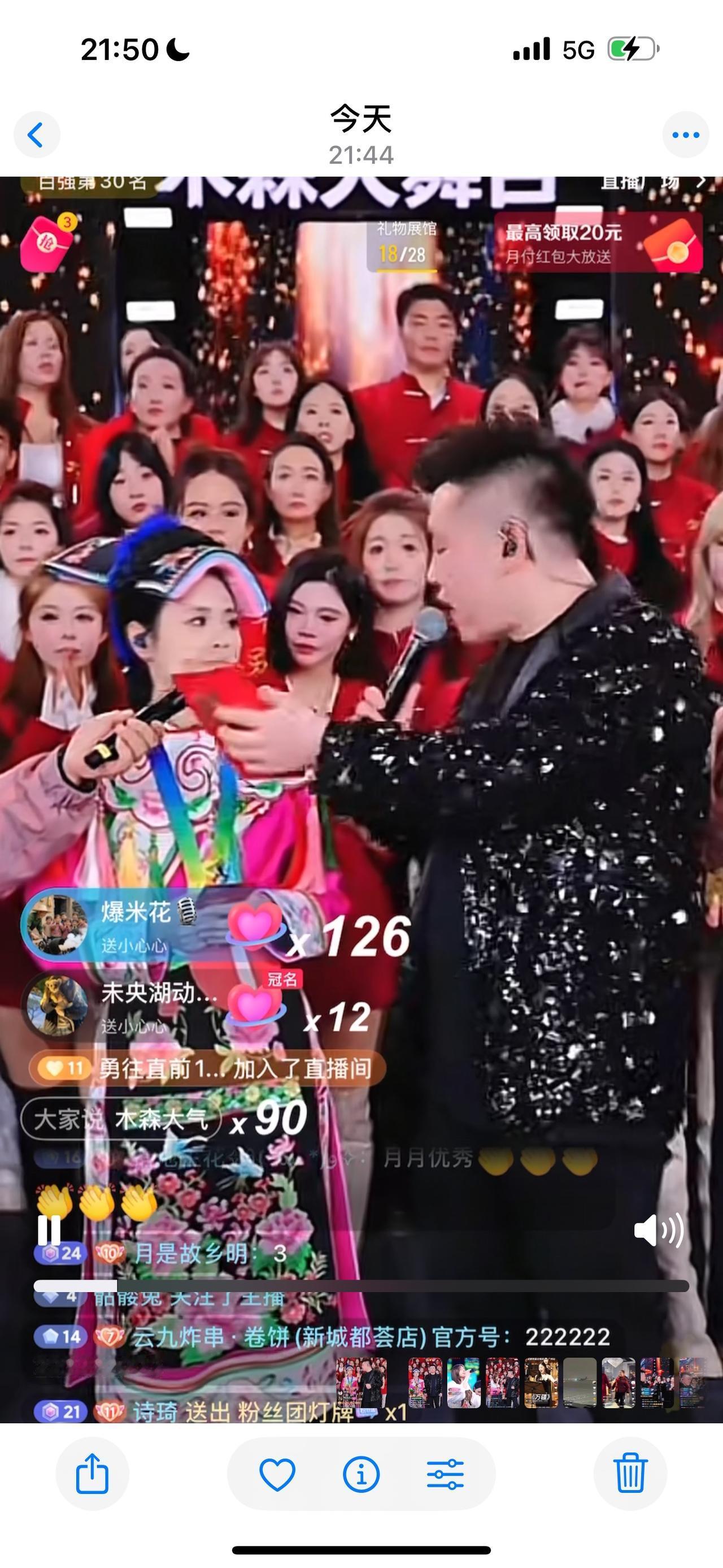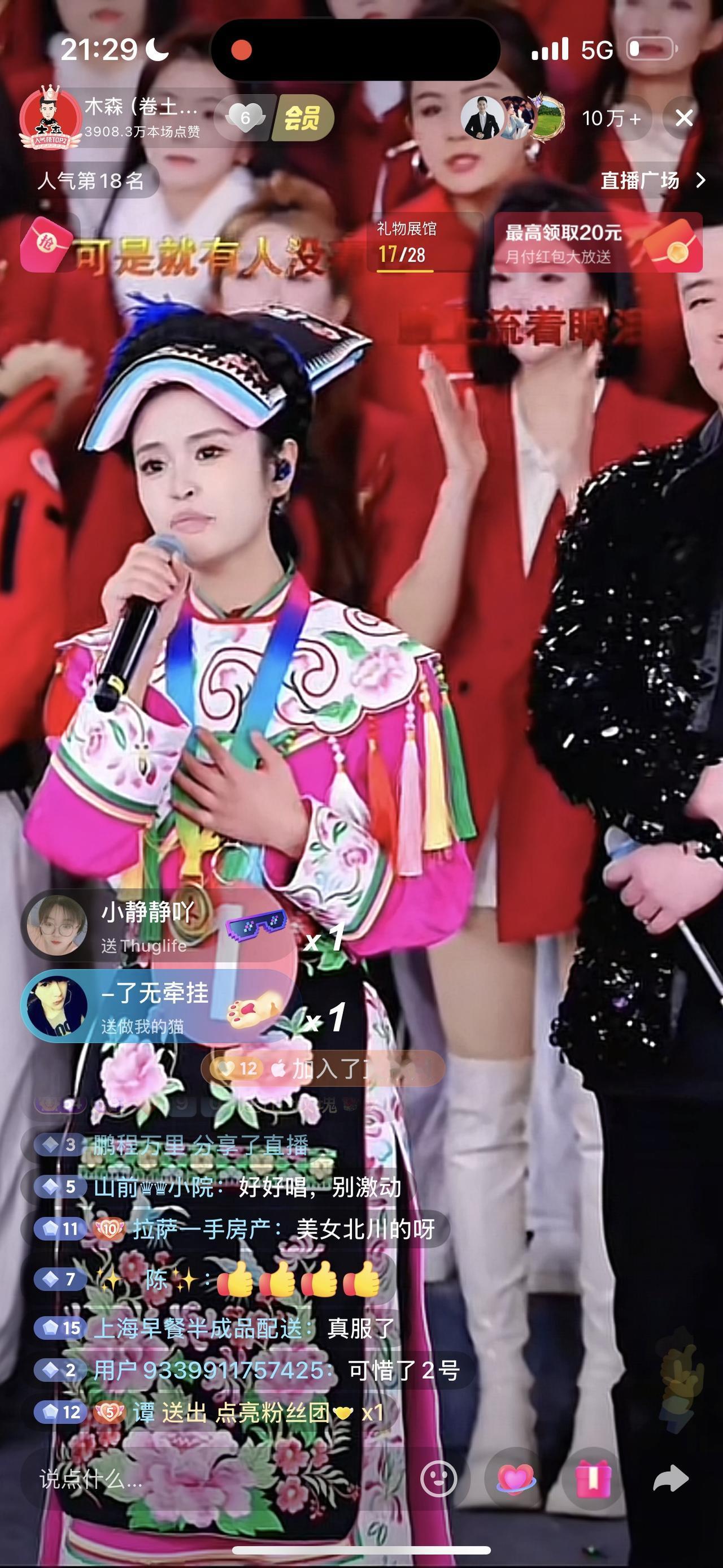 今晚,木森大舞台来了一位名为够野的伤残姑娘,她是2008年四川汶川地震受伤了,当年曾在西安西京医院进行了治疗,她说西安是她的第二故乡,感谢西安西京医院的叔叔阿姨们。今晚,她在大舞台唱了三首歌,《铿锵玫瑰》、《谢谢你》、《我想有个家》,唱的还可以,只是在打一万六时,遇到木家优秀艺人月月,没打过一万六这关。就这样没打过一万六这关,木森还是给她一个红包,木森没说具体钱数,只说是一份心意。木森这一举动,还是很感动人的,也体现木森的大气,大爱无疆,木森大舞台是满满的正能量,木森也经常在经济上帮助来大舞台唱歌有困难的选手,粉丝们有目共睹,相信木森大舞台越办越好。