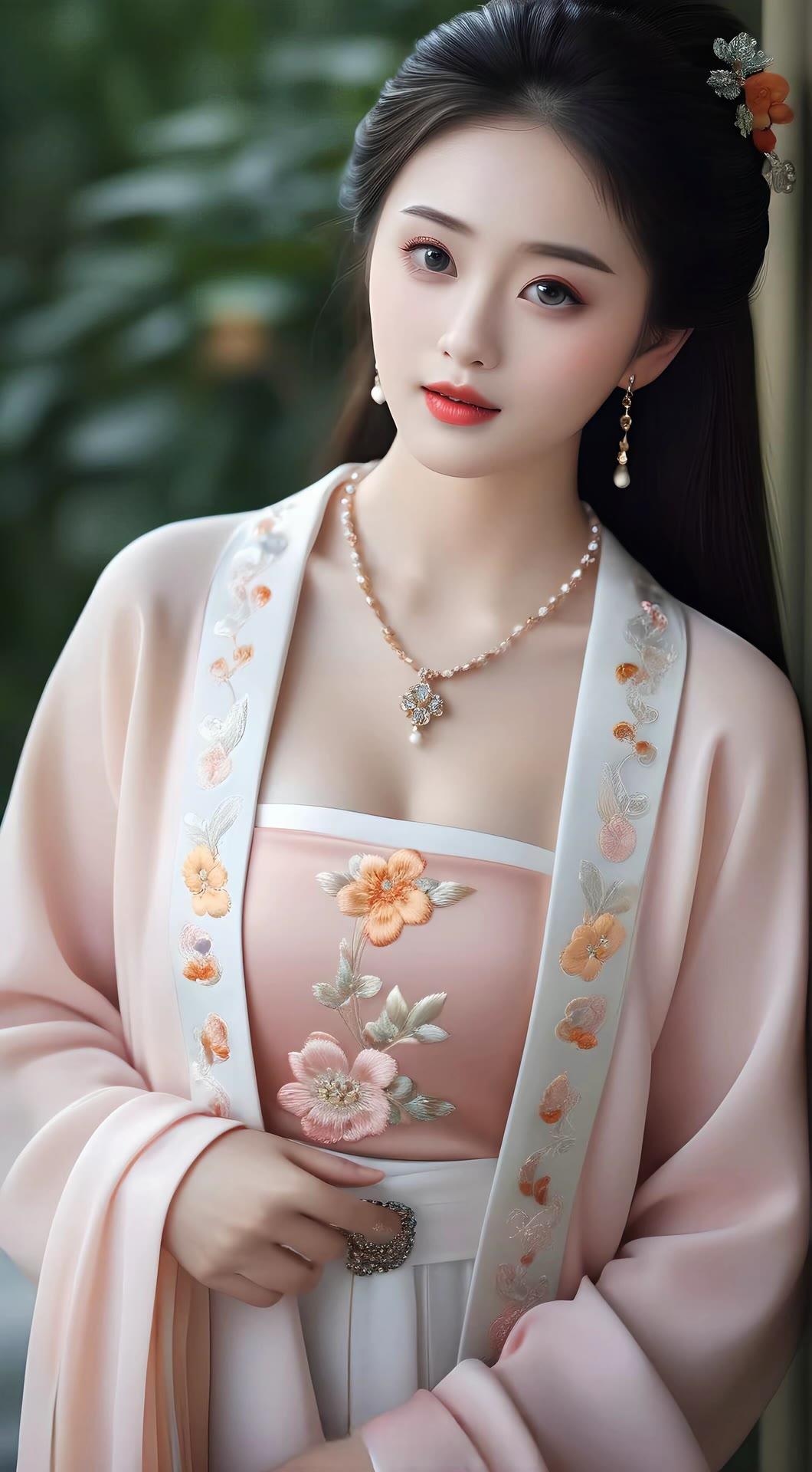 温婉古风少女,粉嫩花朵装点,古典韵味十足