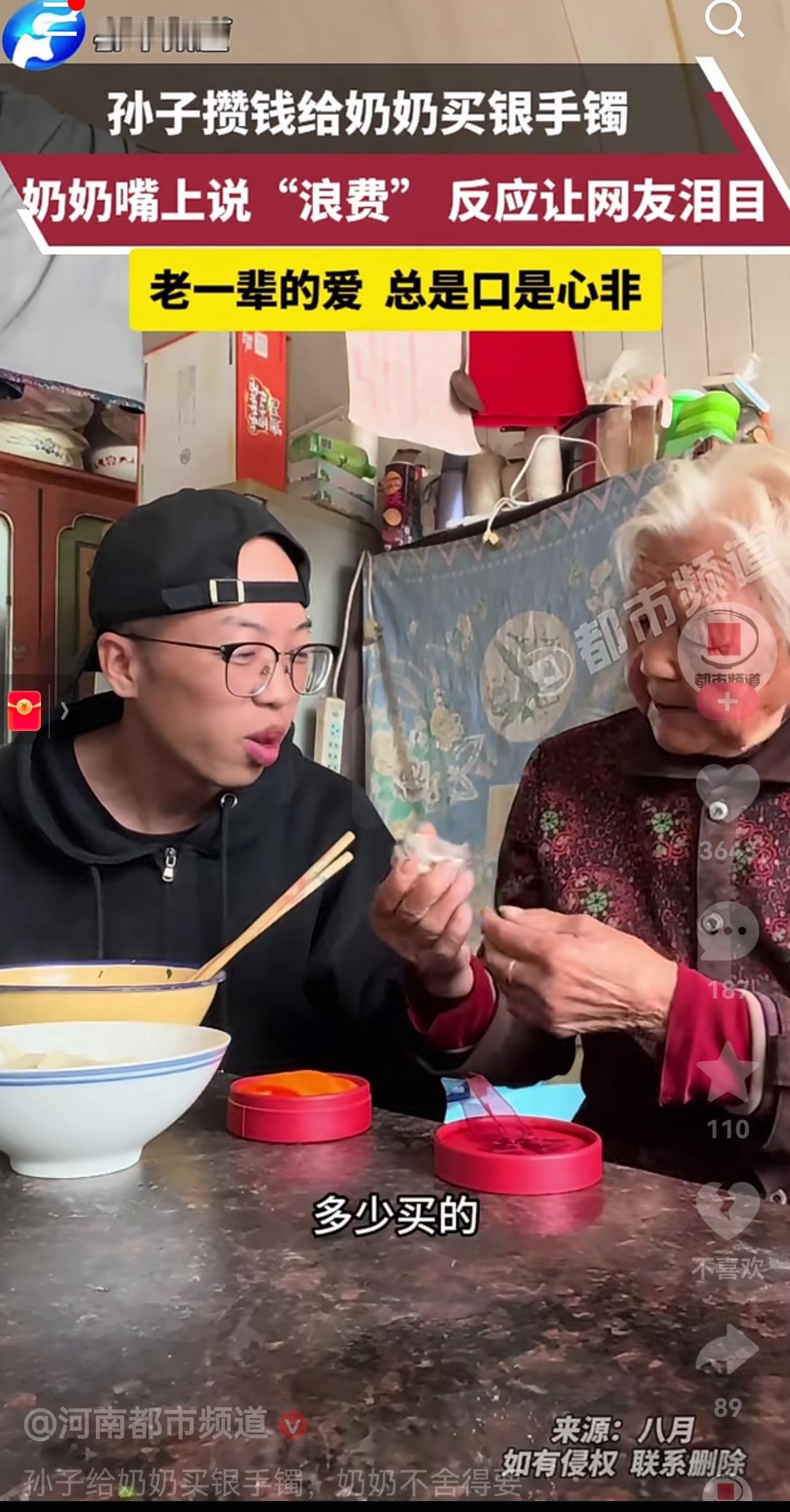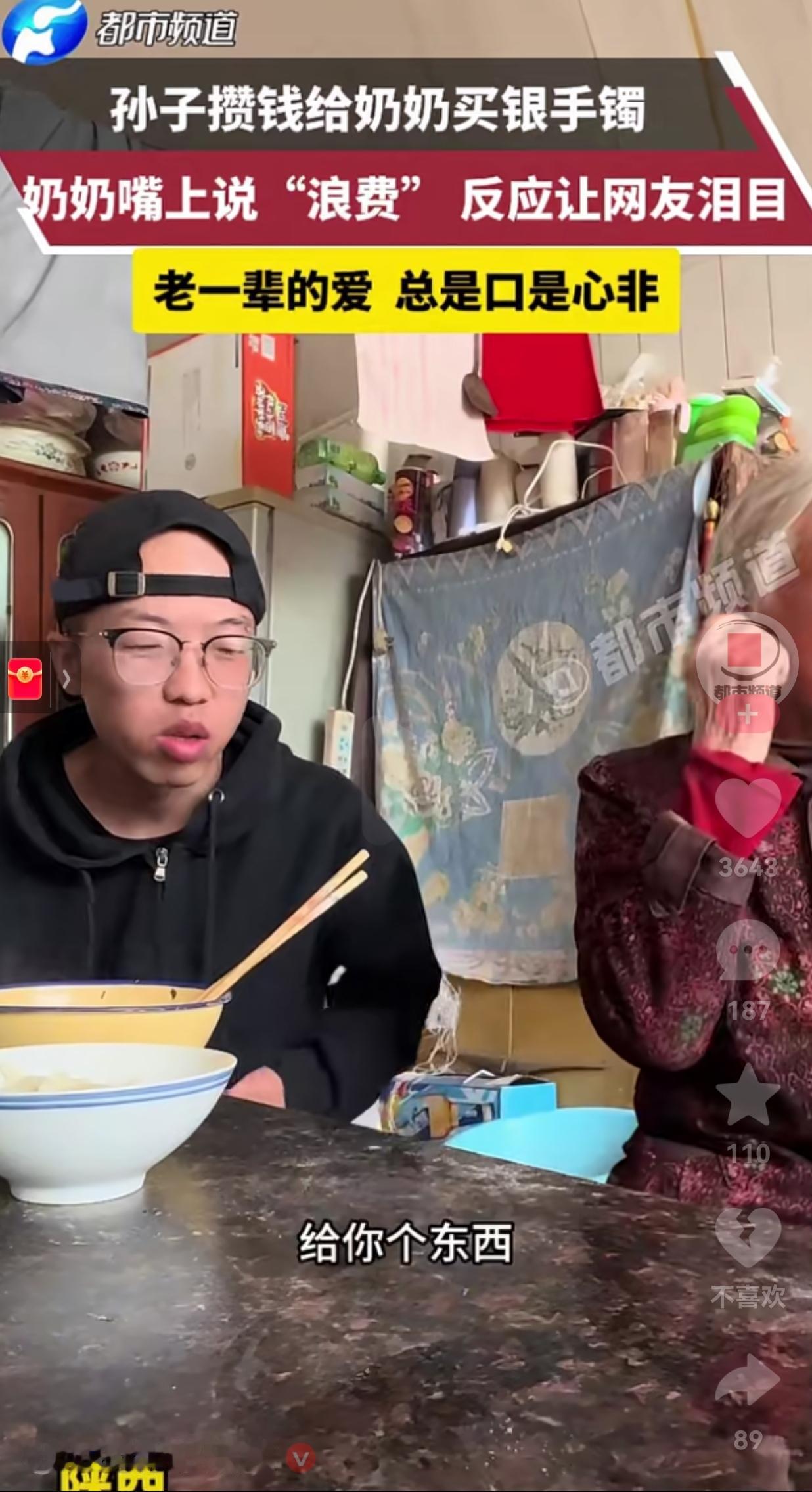 孙子攒钱给奶奶买银手镯,奶奶嘴上说“浪费”,可是,却爱不释手。网友:老一辈的爱,总是口是心非。 饭桌上,孙子突然从兜里掏出个红盒子递给奶奶,孙子说:“给你个东西”, 老人看到孙子给自己买礼物了,嘴里一直念叨着:“这是个什么东西呀!”, 一开始奶奶还误以为是手机,等掏出亮闪闪的银手镯时,第一句就追问“多少买的”,孙子笑着回了句“你管多少买的了。” 奶奶害怕孙子乱花钱,一直追问孙子:“就说多少买的”,甚至还打趣道“你是不是给你女朋友买的?” 孙子连忙摆手:“不是给人家买的”,就是给你买的,奶奶叹着气念叨:“哎呀真的是,不用给奶奶买这些,不用乱花钱”。 虽然,奶奶嘴上说乱花钱,看得出来,奶奶很喜欢孙子送的礼物因为,奶奶一直反复看着眼前的银手镯。 最后,孙子给奶奶戴上手镯,奶奶还在反复追问“多少钱啊,娃”,嘴里依旧说着“不要乱花钱”。 孙子却笑着回了句“我穷的就剩下钱了”,一边说一边把银镯往奶奶手腕上套。 等镯子戴好之后,奶奶对着镜头举起双手,向网友展示,而此时此刻,老人的脸上笑开了花。 这一幕被拍下来传到网上,有网友说:“我奶奶也是这样,去年给她买了双棉鞋,她骂我半天,结果天天穿着出门,跟老姐妹说孙女买的。” 还有的网友说:“我现在每次给爸妈买东西,都得说清仓处理才几块钱,他们才肯收。” 其实我们都明白,奶奶们不是真的觉得浪费,而是习惯了节俭,更习惯了把自己放在最后一位 这事儿也让我琢磨,我们总说要孝顺,可到底啥是真的孝顺? 我想就是把老人的喜好记在心里,用他们能接受的方式,让他们知道自己被惦记着。 哪怕只是一个小小的银手镯,一句带着玩笑的“我穷得就剩钱了”,都能让老人家心里暖乎乎的。