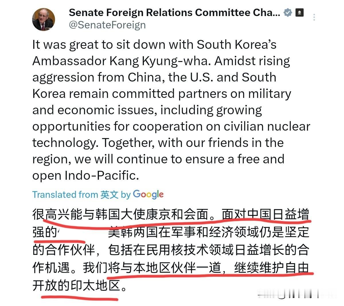 美国开始敲打李在明了!李在明访华行程刚一结束,美国参议院外交关系委员会主席吉姆·里施就约见韩国驻美大使康京和,其表态对我们非常不友好!1月8日,吉姆·里施刊文表示,很高兴能与韩国大使康京和会面。此人声称,面对中国日益增强的“侵略性”,美韩两国在军事和经济领域仍是坚定的合作伙伴,包括在民用核技术领域日益增长的合作机遇。 我们将与本地区伙伴一道,继续维护自由开放的印太地区。很显然,美国方面与韩国驻美大使的会面这非常不同寻常,从时间上来说,这样的会面恰好卡点在李在明刚刚访华结束之后,这样的时间安排绝对不可能是巧合。某种程度来说,美国是等着李在明访华行程一结束,就急于与韩方人士会面,表达其立场。 李在明访华,目的之一就是修复与我们的关系。但,美国明显对此不乐见,美国方面声称所谓中国的“侵略性”日益增强,这明显就是在敲打韩国,意在告诉韩国,韩国最好是把握好分寸,不要跟中国走的太近。美国强调“美韩两国在军事和经济领域仍是坚定的合作伙伴”,这就是提醒韩国,韩国应该跟美国站在一起。 很显然,从美国的所作所为来看,美国绝对不希望韩国跟我们走的太近。因此,中韩关系刚取得一点进展,美国就出来施压拉拢韩国了。当然,面对美国的施压,接下来韩国的态度非常的关键。韩国是顶不住美国的压力,回调自身立场,缩回去;还是展现高超的外交手腕,在中美之间取得平衡,这就非常值得我们关注了。
