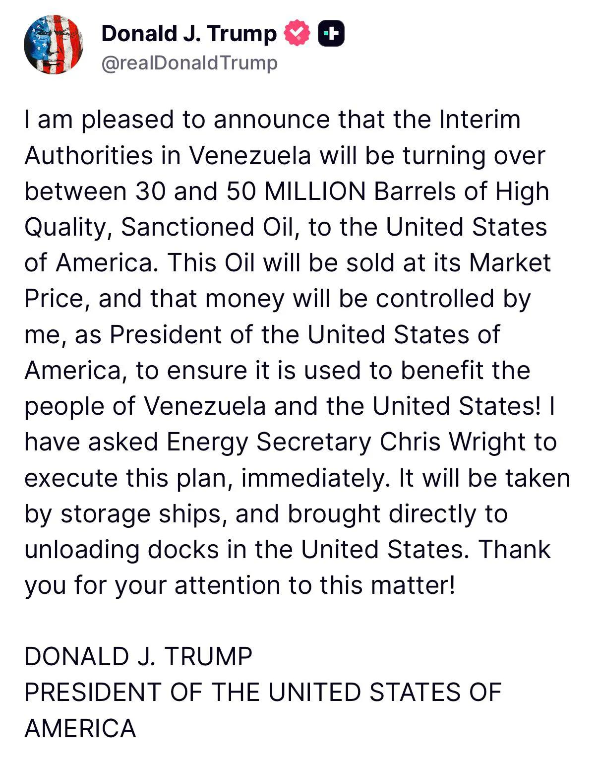 原来美国在委内瑞拉搞事还是为了石油。 美国总统特朗普宣布,委内瑞拉临时当局将向美国移交 3000 万至 5000 万桶高质量、受制裁的石油。 这些石油将直接运抵美国,并按市场价格出售,所得资金将由美国总统控制,以确保这些资金用于造福委内瑞拉人民和美国人民!