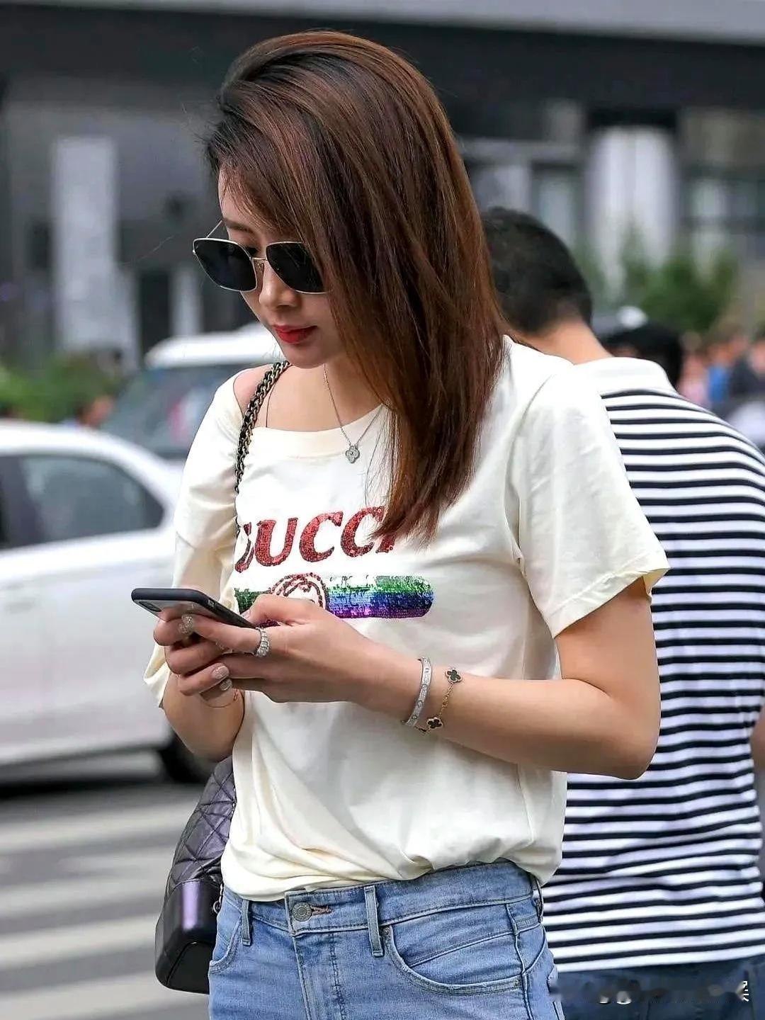 GUCCI T恤穿搭确实能让人在时尚街拍中酷炫有型。就像达科塔·约翰逊,她穿白色T恤搭配Gucci黑色logo印花裤和乐福鞋,简约又时尚。白色T恤经典百搭,质地和版型好,贴合身体线条。而Gucci印花裤是亮点,标志性的logo很容易让人认出,高腰宽松裤脚设计还能修饰腿型。 刘雯、倪妮也展现了GUCCI式性感。刘雯用短款卫衣叠搭牛仔半裙,随性时髦;倪妮皮衣配皮质半裙,美得移不开眼。用GUCCI T恤搭配不同下装和配饰,咱普通人也能在街头拍出时尚大片。
