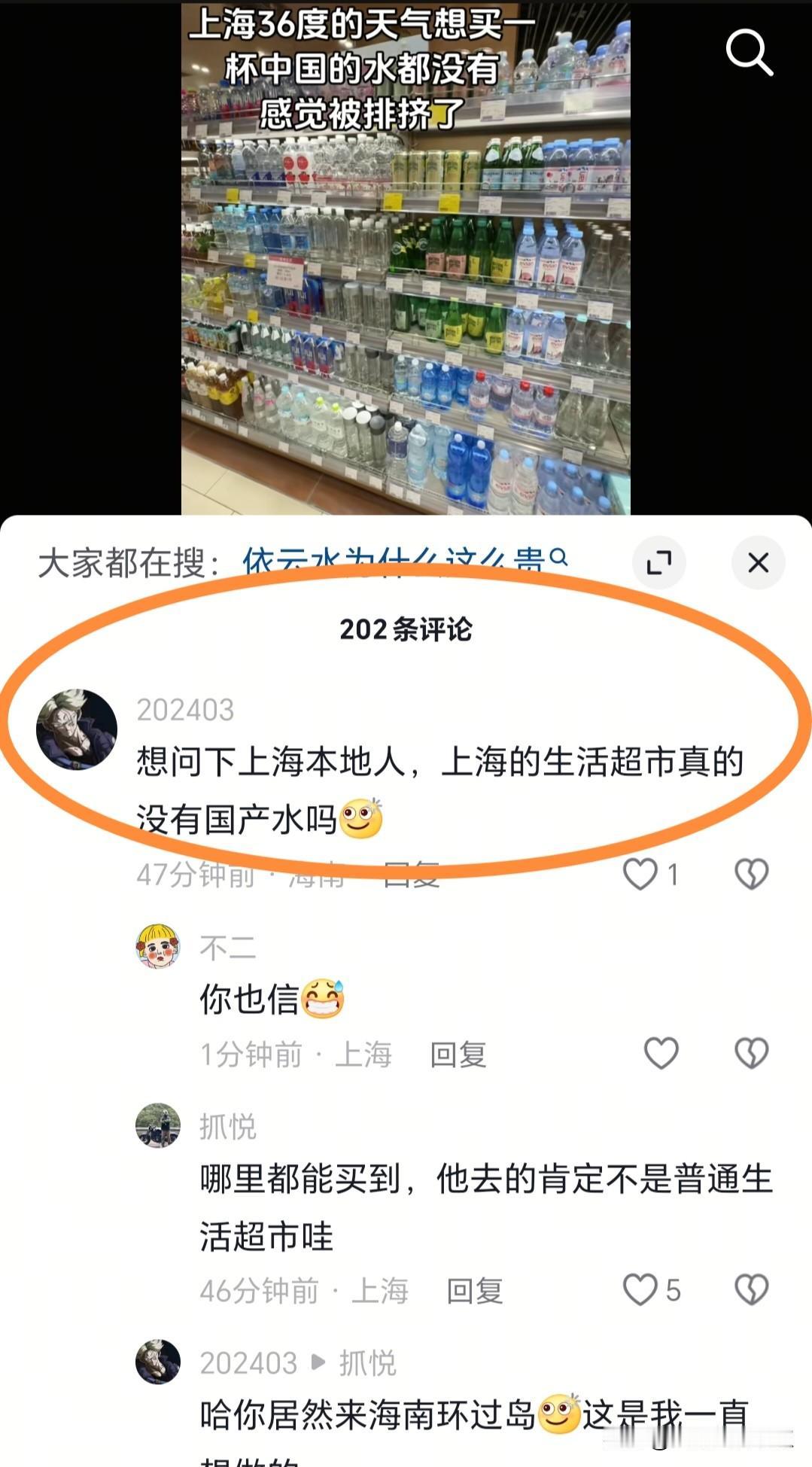 这是我这几个月来见到的黑上海最厉害的视频。有个沪漂女子在2025年夏天在上海市区游玩,因为天气热所以她想去买瓶水喝,然后进了一家店发现全是进口水而且价格很贵,这下把这个外地女子激怒了,马上发视频说为什么在上海就是买不到一瓶中国水呢?然后有一个海南沪黑留言称在上海真的买不到国产水吗?那么请问上海的网友,这个女沪黑真的在上海买不到中国水吗?