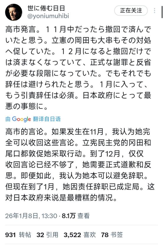 我觉得这个观点非常准确。 11月,高市早苗还可以撤回言论,12月,高市早苗需撤回言论,并道歉,到了1月,高市早苗只能选择辞职了。 把时间拉回11月,高市早苗刚在国会众议院预算委员会上说出重磅言论。当时最大在野党立宪民主党议员冈田克也追问她,她直接说台海要是发生武力冲突,有可能构成日本能行使集体自卫权的“存亡危机事态”。 这话说白了就是鼓吹“台湾有事就是日本有事”,暗示日本可能军事介入台海问题,直接碰了一个中国原则和中日关系的底线。但那时候,局势还没到没法挽回的地步。 她要是能赶紧撤回言论,这场危机就能压下去。当时立宪民主党的冈田克也这些议员已经明着催她采取行动,这就是给她递台阶了。从当时的情况看,中方的反应还停留在严正交涉阶段。 11月13日,外交部副部长孙卫东紧急召见日本驻华大使提出强烈抗议,之后还把她的言论当成联合国大会正式文件散发,核心诉求就是希望日方纠正错误。 日本国内的反对声音也才刚起来。11月21日有1700个民众聚在首相官邸前抗议,前首相鸠山由纪夫、石破茂也公开批评她的言论越界,但那时候的反对声还没形成全民都在说的舆论浪潮。 更关键的是,美国没公开支持她。特朗普在11月24日和中方元首通话时,表态理解台湾问题对中国的重要性,之后还敲打她别激怒中方,可也没强迫她撤回言论,算是给了她体面。 这个阶段的高市早苗,顺着台阶收回那番错话,承认自己说的不合适,就能平息大部分争议,后面的一堆麻烦都能避免。可惜她偏要硬扛,在国会答辩时还说自己的言论符合日本政府的看法,没打算撤回,亲手把第一个止损的机会关死了。 到了12月,局势已经变了性质。这时候再只撤回言论就不够了,必须正式道歉还要深刻反思,这样才有机会不辞职。经过一个多月的发酵,高市早苗的错话已经引发了一连串反应,负面影响越扩越大。 中方的反制措施已经落地了。11月就发布了赴日留学预警和旅游提示,明确建议中国公民谨慎安排去日本的行程。这直接冲击了特别依赖中国游客的日本旅游业,相关行业协会已经开始给政府施压了。 日本国内的反对声也越来越大。最大在野党立宪民主党不光一直追问,党首野田佳彦还直接批评她的言论让中日关系陷入严峻局面,说她太轻率。 日本共产党也多次要求她撤回言论,强调她的话在激化两国对立。更重要的是,商界的担忧已经变成了实际压力。中日贸易往来出现了波动,日本企业界也慢慢意识到,高市的错话正在让日本经济吃亏。 这时候,大家的要求已经从“撤回言论”变成了“道歉反思”。因为大家都看明白了,她的话不是随口说错,而是背后根深蒂固的右翼想法在作祟,是故意挑战战后国际秩序和中日之间的共识。 要是这时候高市早苗能放下执念,公开撤回涉台言论,向中方和本国民众正式道歉,承认自己的话加剧了地区紧张、损害了国家利益,或许还能靠道歉的诚意争取到一些人的谅解。就算政治声誉受点损失,至少能保住首相的位置。 可她还是回避问题,只在国会讨论时含糊其辞地说“没打算提到任何具体情境”,压根不承认自己错了。这种敷衍的态度让局势更糟,也把第二个转圜的机会给关上了。 进入2026年1月,高市早苗已经没任何退路了,因为这件事负责辞职已经成了定局。这时候,她的错话已经把日本拖进了实实在在的困境里,国内外的压力都到了顶点。 中方的反制措施还在升级。1月有消息说,日本三大经济团体本来计划访华推动经贸合作,结果被婉拒接待了。这是13年来头一次发生这种事,直接戳中了日本经济的痛点。 要知道,中国是日本最大的贸易伙伴,中日经贸关系一停滞,本就不景气的日本经济只会更差。经济界对高市政府的不满已经摆到明面上了。 国内的抗议活动也越来越激烈,“高市下台”“撤回言论并道歉”的口号在首相官邸前到处都是。民众的愤怒已经不只是针对她的言论了,而是升级成对政府执政能力的怀疑。 日本政界也达成了批评的共识。不管是在野党,还是自民党内部的资深议员,都觉得她的言论突破了历届政府的底线,把日本放在了危险的境地,必须有人出来担这个责任。 更让她绝望的是,她本来指望的美国盟友一直没出声。从言论风波闹起来到现在,美国国务卿、国防部长这些核心高层,没一个人公开表态支持她。这种集体沉默,本身就是抛弃她的意思。 到了这一步,所有能缓冲的空间都没了。就算现在撤回言论、道歉反思,也没法挽回已经造成的损失,更平息不了各方的怒火。高市早苗这个人,已经成了影响中日关系、搅乱地区稳定、拖累日本经济的最大隐患。 只有辞职,才能给国内外一个交代,才能平息这场闹了两个多月的政治危机。这也印证了“世に倦む日日”的判断,1月份的她,辞职已经不是选不选的问题,而是必须要走的路。