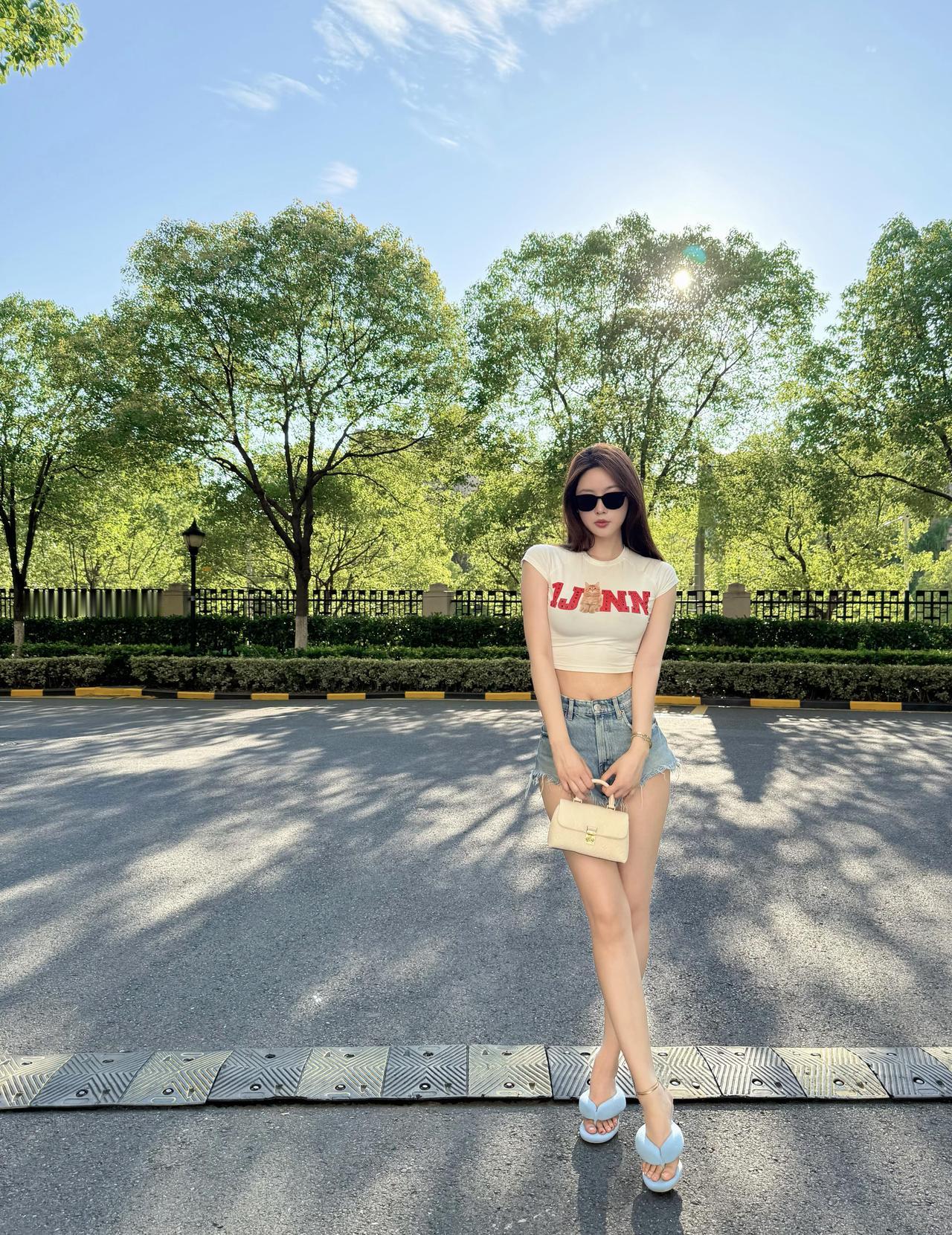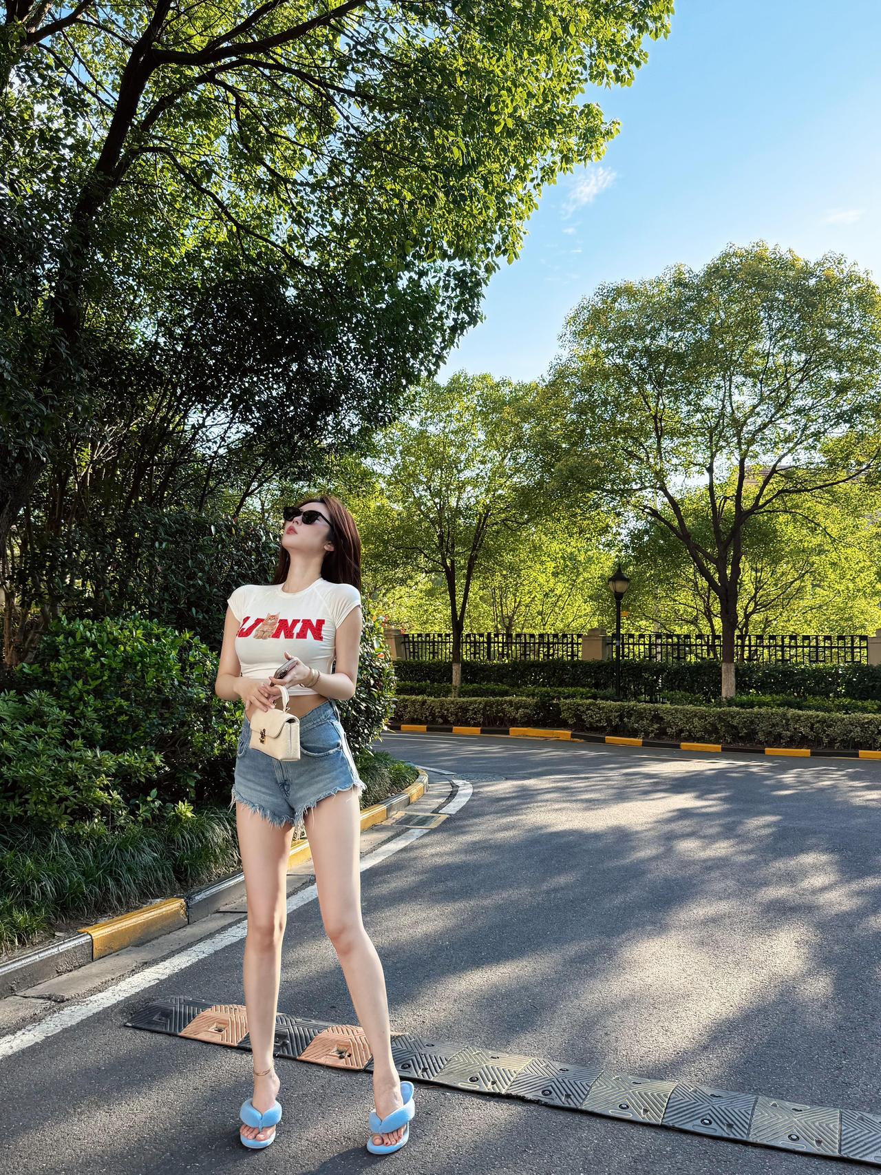 夏日的风,是甜的 阳光把天空揉成一块透亮的蓝玻璃 云片懒懒散散飘着,像没睡醒的棉絮 树站在路边撑开绿伞 叶子被晒得发亮,风一拂就抖落满地碎金 我踩着浅蓝拖鞋踩上柏油路 鞋底磕到减速带的纹路,哒哒响 像敲着夏天的小鼓点 白T恤贴在后背,牛仔短裤的毛边蹭着大腿 风从领口钻进来,绕着腰转了个圈 凉丝丝的,把闷热都吹跑了 墨镜把世界滤成柔和的色块 抬眼时,阳光从树叶缝里漏下来 落在鼻尖,暖烘烘的,却不烫人 张开手臂的那一刻 像要抱住整阵夏日的风 手里的小包晃了晃,金属扣的光一闪 又跌进树影的褶皱里 仰头对着太阳的方向眯眼 蝉鸣藏在树叶里,一声叠着一声 是夏天最热闹的背景音 不用赶时间,不用想未接的消息 就站在这光影里 让树影慢慢拉长,让风穿过指缝 让拖鞋碾过路面的光斑 把此刻的松弛,捏成一颗糖 含在嘴里,甜滋滋的 连呼吸都是夏天的味道 柏油路被晒得微微发烫 拖鞋底隔着一层薄胶,能摸到路面的粗糙 像触到了夏天最真实的肌理 远处的围栏黑亮亮的,围着丛丛绿灌木 一切都慢下来了 慢到能看清阳光移动的轨迹 慢到能听见自己的心跳 和夏天的风,一起轻轻晃