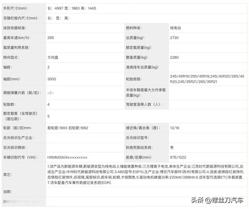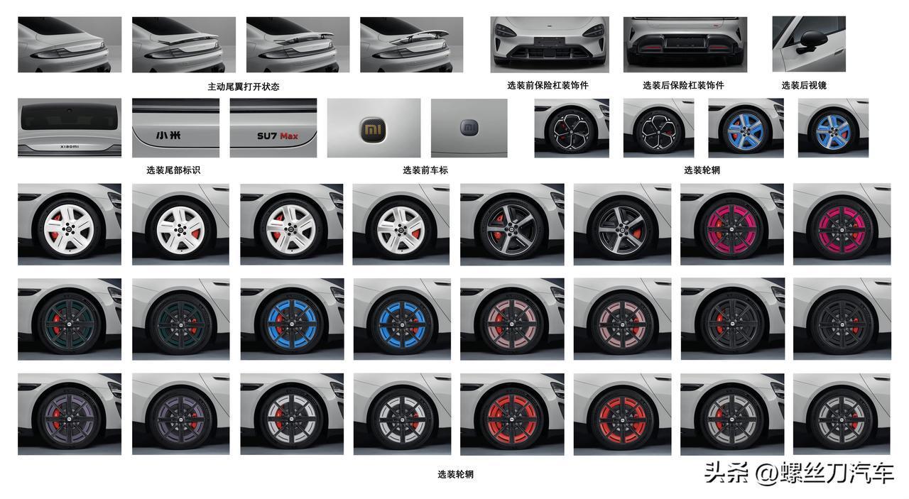外观选装又玩出新花样?新款小米SU7申报图来了! 日前,我们在工信部看到了新款小米SU7申报图,展示了小米SU7更多细节信息。此前,新款小米SU7已经公布预售价,预售22.99-30.99万元,仍然提供SU7、SU7 Pro、SU7 Max三款车型,最大续航达到902km。 申报图上新款SU7与官图基本保持一致,我们看到了小米SU7的经典轮圈样式,此外,新车还可以选装多种样式的轮圈。另外,新款小米SU7也可以选装金色LOGO,而车辆的尾部,北京小米的字样已经去除了北京,仅保留小米字样。 车型尺寸方面,新车长宽高分别为4997/1963/1445mm,轴距为3000mm,与现款车型保持一致。此次申报图申报了单电机版和双电机版车型,单电机版最大功率235千瓦,最高车速240km/h;双电机版前电机220千瓦,后电机288千瓦,最高车速265km/h。电池方面,仍然来自于弗迪磷酸铁锂电池和宁德时代三元锂电池。 可以见到,某个轮辋中的点缀颜色拥有相当丰富的可选项。看来,未来新款小米 SU7 上市后,如何搭配个性化元素,会是难倒用户的一个难题!大家期待吗?[灵光一闪]