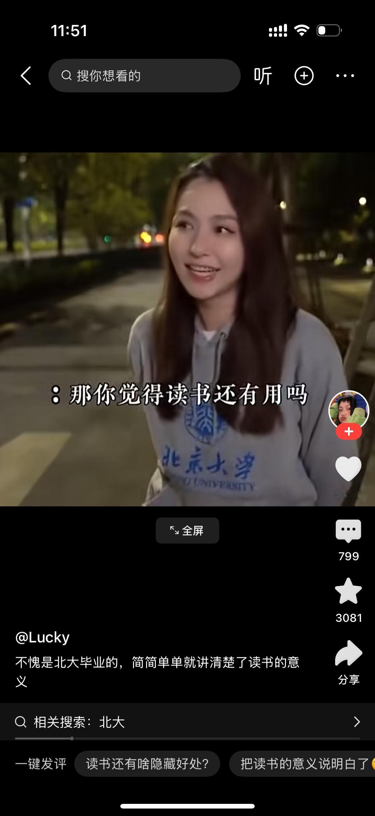 女孩说自己是北大毕业的。记者问,那你在北京买房了吗?女孩说,你想多了,买不起一点。记者说,那读书有什么用?人家不读书当网红能挣钱,能在北京买得起房,反而清华北大都买不起呢?女孩说,不能这么说吧。网红挣大钱的人也是千里挑一。而上985的人平均赚钱能力都不差。你拿最好的网红和最差的985比没有意义。女孩言之有理,网红挣的是钱,985过的是生活。