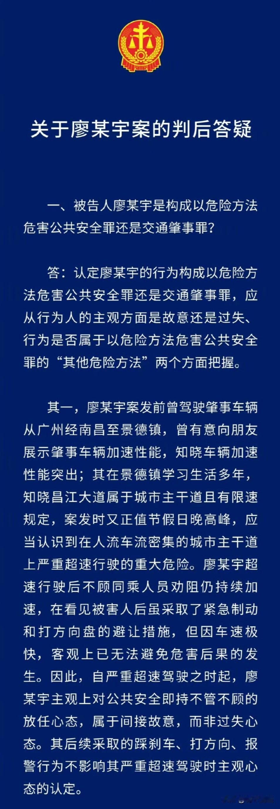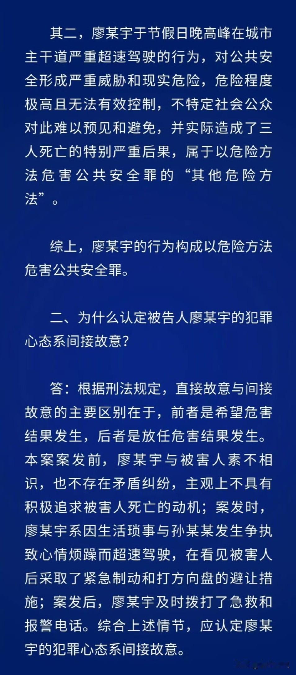 去年10月,廖姓司机,开车的时候和女朋友争论“鹦鹉学舌历史”之类的事情,吵到情绪完全失控,男子在限速只有40的闹市区,把车飙到了129公里每小时,结果,车子撞上了出行的一家三口,一个好端端的家庭,就这么碎了。 今天法院一审判决,给他定了“以危险方法危害公共安全罪”,判处死刑,缓期二年执行。 为什么没判立刻执行呢?法院主要说了两个原因: 第一,法院认为他当时是间接故意。撞上去之前那一瞬间,他看到人了,也猛踩刹车、猛打方向盘想躲开。 第二,出事后他马上自己打电话报警,也没跑,就在现场等着,这个算作了自首。 受害者的家属,是完全不能接受这个结果的。他们从头到尾就一个要求:死刑,立即执行。他们当庭就说要抗诉。之前肇事方说赔80万,还说以后出来给养老。受害者的家属强调:“三条人命无法用金钱衡量”。 一切都源于一场毫无意义的争吵。为了一句“鹦鹉学舌”的争论,搭进去三条无辜的生命、一个完整的家庭,还有两个老人的余生,这事真的挺荒唐的。