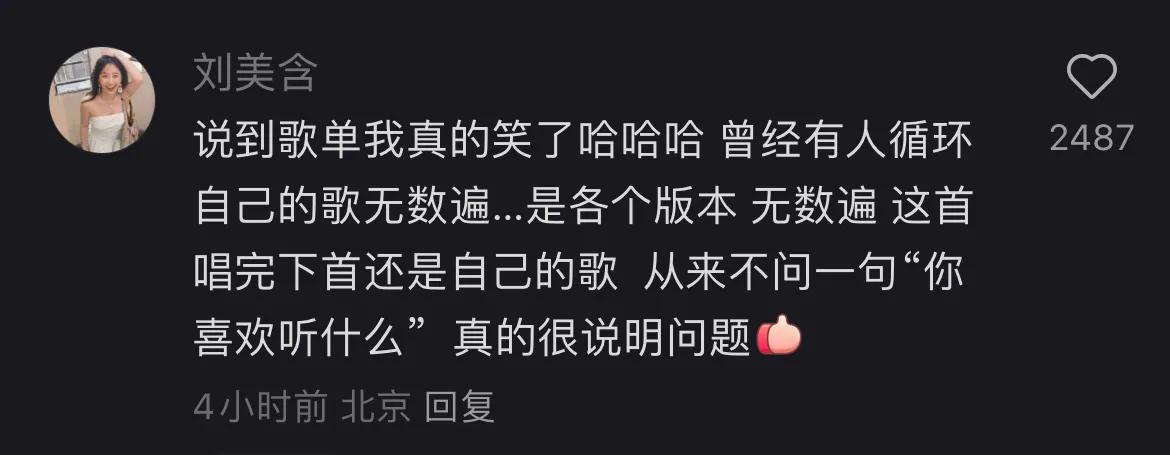 刘美含说对方从来不问她喜欢什么,所以是谁啊? 这是在说哪位前男友?刘美含去网友那留言评论:“曾经有人循环自己的歌无数遍...是各个版本 无数遍 这首唱完下首还是自己的歌 从来不问一句‘你喜欢听什么’真的很说明问题[赞]” 去年七夕,刘美含发了条微博“15年,3.5个月,10个字,52分钟。你当然是个好人,原来我们从来不是例外 ”。文案内容疑似是张远的歌词,网友还发现刘美含已经取.关张远。 都知道他俩是多年好友,还上过很多次节目。此前两人总是以“父女情”互动(刘美含称张远“远爸”,张远称其为“理想中的女儿”),要是没发生什么,怎么会轻易绝交呢? 不过刘美含与张远均未就“恋爱传闻”作出正式回应,这场由“一句评论”引发的感情猜测,仍在网络上持续发酵。女方总莫名其妙的发些东西,到底是不是张远也不知道[捂脸]发一些文字还不如一句话完整把事情说清楚了。
