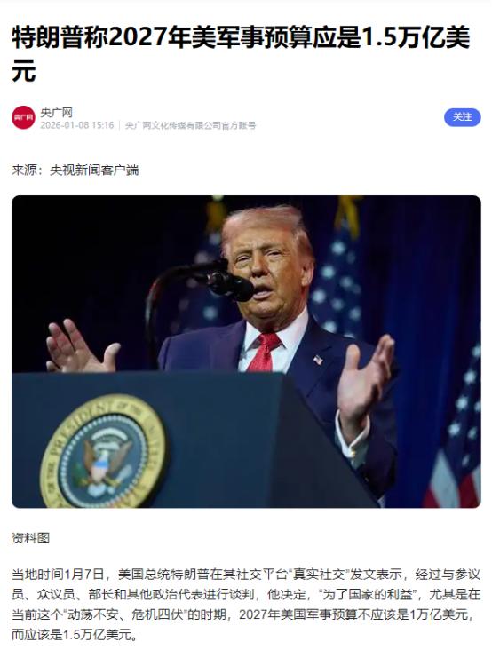 美国改口了。当地时间1月7日,特朗普公开发文表示:他决定,为了国家的利益,尤其是在当前这个动荡不安、危机四伏的时期,2027年美国军事预算不应该是1万亿美元,而是1.5万亿美元。 他说这么做是为了国家利益,尤其是现在世界动荡不安、危机四伏,这笔钱能让美国打造更强大的军队,甚至是“梦想军队”。 首先得说清楚,这1.5万亿美元可不是小数目。要知道2026财年美国国会刚批的军费也就9010亿美元,短短一年时间就要暴涨66%,多花出来的5000亿美元比很多国家全年的GDP都高。 特朗普倒是说得轻松,称这笔钱能轻松拿出来,全靠向其他国家征收关税带来的巨额收入。 可美国国会预算办公室早就有过预测,这些关税政策未来11年总共也就只能增加2.5万亿美元收入,平均到每年也就2300亿美元,连新增军费缺口的一半都填不上。 更麻烦的是这些关税的法律基础还悬在半空,美国最高法院马上就要裁决总统能不能单方面靠《国际紧急经济权力法》收关税,能不能拿到这笔钱还不一定呢。 特朗普口中的“梦想军队”,也不是随便说说的空想,背后藏着一套具体的造舰计划。 他早之前就放话要建两艘“特朗普”级新型战舰,后续还要扩充到8到10艘,最终目标是20到25艘,再加上3艘航母和12到15艘潜艇,凑成一支所谓的“黄金舰队”。 这种新型战舰排水量高达3万到4万吨,比美军现在最大的“朱姆沃尔特”级驱逐舰还大两倍多,不仅要装大量导弹和舰炮,还得配高超声速武器、电磁炮甚至带核弹头的巡航导弹。可理想有多丰满,现实就有多骨感,美国造船业的现状根本撑不起这份野心。 美军造舰的拖延症早就不是秘密了,最好的项目都要延期半年以上,预算超支更是家常便饭,之前的“星座”级护卫舰直接被拖到取消,“约翰·肯尼迪”号航母也晚了两年交付。 更关键的是“特朗普”级战舰需要的很多装备都还没研发成功,比如美国海军2021年就因为技术问题叫停了电磁炮项目,现在要重新捡起来装到新舰上,光研发就得耗好几年。 美国智库的专家都直言,这种新型战列舰最早也得到本世纪30年代初才能交付,2027年想靠这笔军费建成“梦想军队”,纯属异想天开。 更让人看不懂的是就在特朗普提出增加军费的同一天,他还签署备忘录让美国退出66个国际组织,理由是这些组织不符合美国利益。 一边疯狂砸钱扩军,一边主动退出国际合作框架,这种操作背后的逻辑其实很直白,就是信奉“丛林法则”,想靠绝对军事实力压服其他国家。 可这种做法已经引发了内部的强烈反弹,就在几天前,因为特朗普未经国会授权就下令突袭委内瑞拉,参议院投票时5名共和党议员直接倒戈,和民主党一起支持限制他的军事权力。 国会对这笔巨额军费的态度也很微妙,德州的共和党众议员奇普·罗伊虽然支持强大国防,但也明确表示要保持财政审慎,言外之意就是筹钱办法得靠谱。 民主党议员更是直接反对,他们指出美国本财年预算赤字已经占到GDP的5.5%,再额外增加5000亿军费,只会让财政窟窿越来越大。 更关键的是五角大楼已经连续八年没能通过年度审计,账本乱得一塌糊涂,现在还要给这样一个部门多批几千亿,不少议员都觉得是拿纳税人的钱开玩笑。 最受伤的其实是美国普通民众。之前的军费已经开始挤压民生开支,清洁空气保护、医疗补助、儿童营养还有教育项目的拨款都被削减。现在要是再增加5000亿军费,这些民生福利只会被进一步压缩。 特朗普这波改口提价,看似是为了美国安全,实则是把军费当成了讨好军工复合体、巩固政治支持的工具。可1.5万亿美元的预算缺口、造舰计划的技术瓶颈、国会内部的分裂还有民生领域的牺牲,每一项都在戳破他的“梦想军队”泡沫。能不能在国会通过都是个大问题,就算真的通过了,最终也可能只是一场劳民伤财的政治秀。 来源:央广网