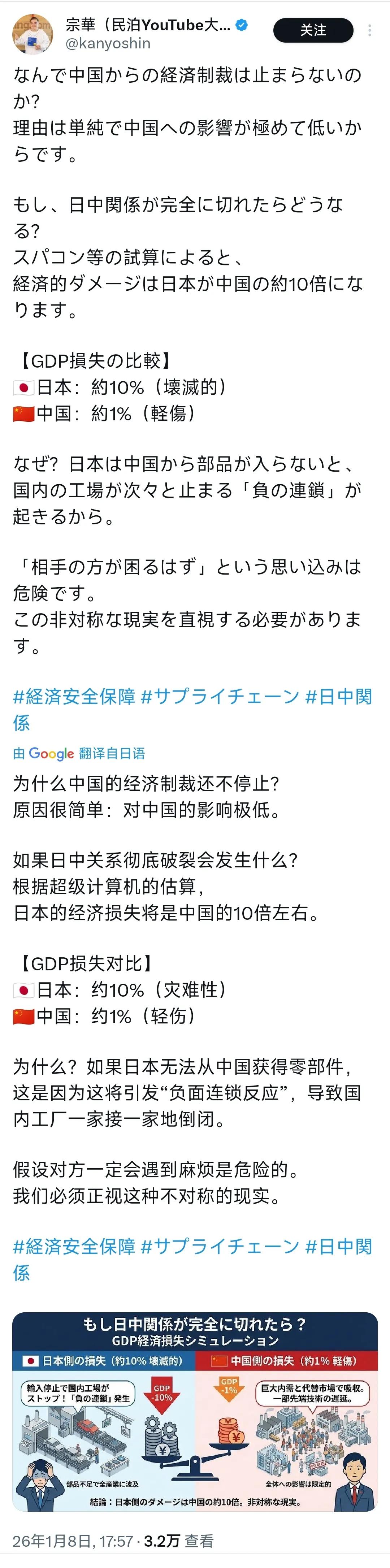 “为什么中国(对日本)的经济制裁还不停止?原因很简单:对中国的影响极低。如果日中关系彻底破裂会发生什么?根据超级计算机的估算,日本的经济损失将是中国的10倍左右。 GDP损失对比:日本:约10%(灾难性);中国:约1%(轻伤)。 如果日本无法从中国获得零部件,将引发‘负面连锁反应’,导致国内工厂一家接一家地倒闭。” 这是日本媒体上盛传的在中国经济制裁下日本和中国经济损失估算。 按这个估算,如果说因为广场协议美国让日本失去了30年(一直认为即使没有广场协议,日本也不可能有太大发展,因为人口数量、国土面积等因素决定了日本经济的上限),那么这次经济制裁将让日本再次失去30年,甚至更多。这一切都是日本咎由自取。 中国不是没给过日本认错纠错的机会,但都被它用开玩笑般地召见中国驻日本大使进行抗议、自以为日本高中国一等的幻觉以及中国不能把它怎么样的错觉拒绝啦。既然给脸不要,那就再没必要客气。现在日本开始慌了,开始认真抗议了,但晚了! 在驳回日本的抗议时,中国给出的对日本进行两用物项管制的原因已经说的非常清楚,那就是为了消除日本对我国家安全的威胁。在没有这个威胁没有消除之前,在把日本变成二流甚至是国家之前,解除制裁,日本想都别想。