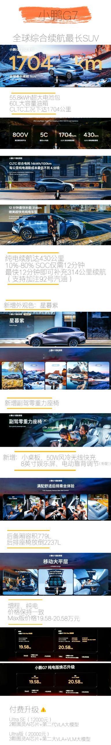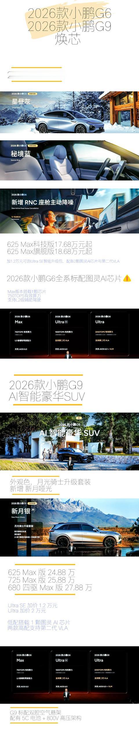 整理了昨天小鹏4款升级新车的内容,不知道有没有全面,但基本重点都在这里了吧~ 2026 款小鹏 P7+、小鹏 G7 超级增程、2026 款小鹏 G6、2026 款小鹏 G9四款车型,这四款车重点推的肯定是2026 款小鹏 P7+,因为用时最长。 2026款小鹏P7+,超级增程有1550 Max 科技版和1550 Max 旗舰版两个版本,官方指导售价分别为18.68万元和19.88万元。 纯电车型分为615 Max旗舰版和725 Max 旗舰版,官方指导价分别为18.68万元和19.88万元。 价格和在目前在售价是一样的 - 新增外观色:新增“星镜蓝” - 前脸设计为无断点样式 - 内饰新增“晨雾蓝”(价格:3000元)和“柔光紫” - 搭载全新8.8英寸液晶仪表、15.6英寸悬浮式中控屏 - 全系采用纯视觉辅助驾驶解决方案,配备1颗辅助驾驶图灵AI芯片 - 支持选装Ultra SE智能升级包 - 标配了29英寸HUD抬头显示 - 前后排静音电吸门 - 20扬声器音响系统等 - 副驾驶零重力座椅 全新小鹏G7的部分呢,也是增程+纯电两款车型 超级增程1704 Max 科技版‌:19.58万元 ‌超级增程1704 Max 旗舰版‌:20.58万元 ‌纯电602 Max 旗舰版‌:19.58万元 ‌纯电702 Max 旗舰版‌:20.58万元 - 增程版车型前脸配备一体式无断点贯穿灯带 - 新增 “星暮紫”配色 - 选装20英寸熏黑轮毂 - 无框车门+隐藏式门把手 - 气宇灰、深空灰、秘境蓝和暖阳橙内饰色 - 后排座椅增加了通风、加热、按摩、靠背电动调节功能 - 8英寸娱乐屏、小桌板及50W风冷手机无线充电(标配) - 选装三颗自研图灵AI芯片 - 座舱系统升级为天玑AIOS 6.0 - CLTC工况下纯电续航430km,综合续航高达1704km - 12分钟快充增加314km 2026款小鹏G6 是625 Max科技版‌17.68万元‌;‌625 Max旗舰版‌‌18.68万元‌。‌ +1.2万元‌可选‌Ultra SE智能升级包‌(配备2颗图灵AI芯片与第二代VLA) +2万元‌可选‌Ultra智能升级包‌(升级为3颗图灵AI芯片,搭载第二代VLA和VLM大模型) 小鹏G9 625 Max版‌24.88万元 ‌725 Max版‌25.88万元 ‌680 四驱 Max版‌27.88万元 - 新增“新月银”外观色,月光骑士升级套装 - Ultra SE 加价 1.2 万元 Ultra 加价 2 万元 整体来说,目前小鹏这四款车型能配齐的东西基本是都给了,而且几乎都是标配了,除了需要加价购买的芯片了。 而这次最大的亮点也就是芯片的部分,和在售车型价格保持一致,就拿芯片来“亮剑”市场。【来自懂车帝车友圈】