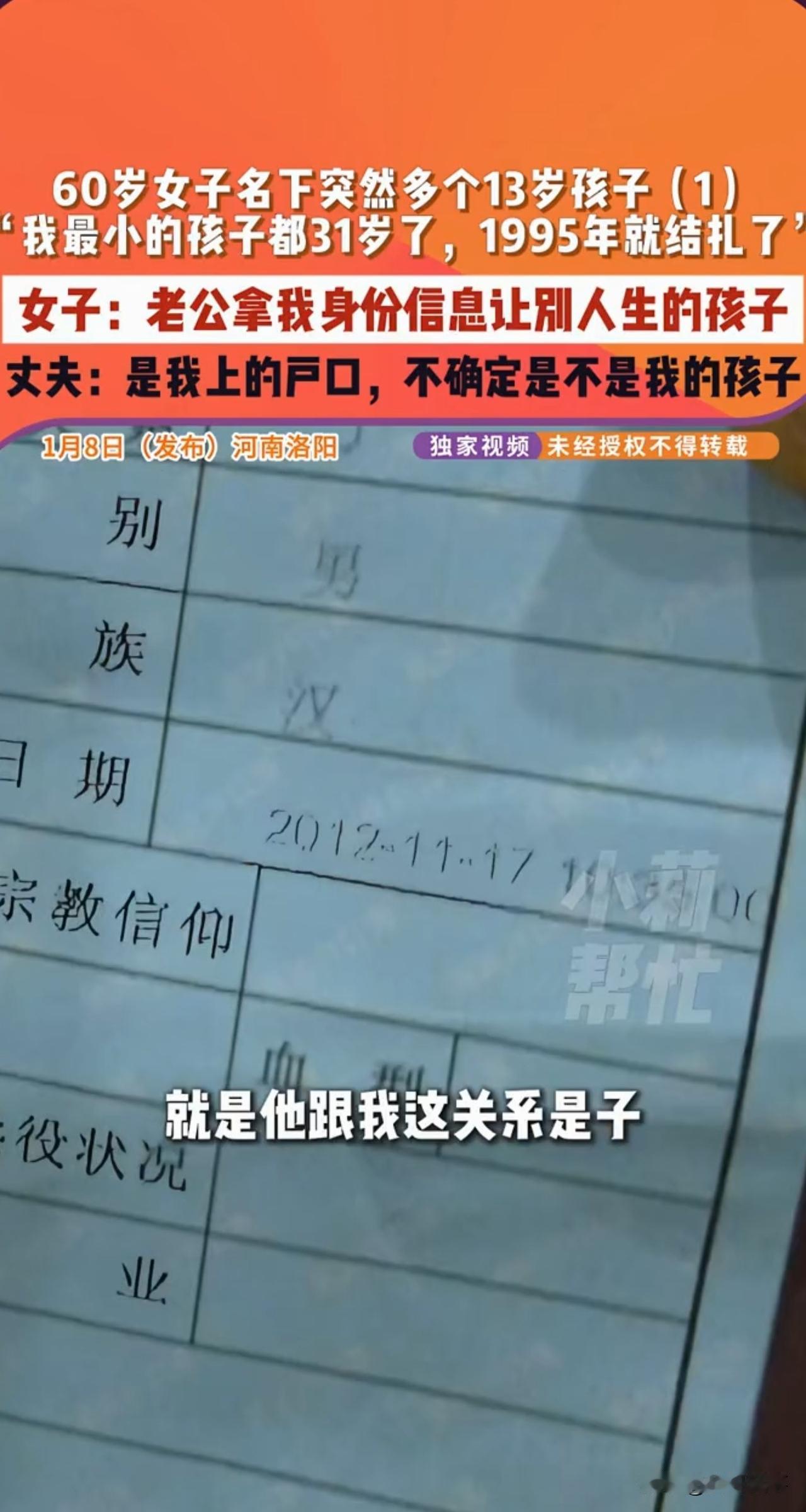 莫名其妙!河南洛阳,一结扎30年的女子突然发现,自己的名下居然有一个13岁的孩子。女子遂怀疑是丈夫出轨所为,经查证,果不其然,丈夫在多年前出轨小三,小三生下孩子后,丈夫便拿着女子的身份信息给孩子上了户口。女子觉得丈夫伤了她的心,便起诉丈夫重婚。 35年前,张女士和丈夫领证结婚,婚后,两人生育了3个孩子,如今都已长大成人,日子过得平淡安稳。 可谁曾想,张女士在一次偶然翻查家里的户口本时,竟发现,自家户口上竟多了个2012年出生的“儿子”,今年都13岁了! 张女士清楚记得,自己明明在1995年就做了绝育手术,根本不可能在2012年生孩子。 这无缘无故冒出来的孩子到底是怎么一回事呢? 为了了解真相,张女士赶紧跑到孩子当年出生的医院调取病历,看到记录的那一刻,她浑身汗毛都竖了起来:产妇姓名、身份证号居然全是自己的,联系人信息赫然是丈夫的名字。 而这一切,自己却全然不知。 张女士立马联想此前自己曾怀疑丈夫出轨。 万万没想到,真相如此伤人:这个“儿子”就是丈夫和外面的女人所生,丈夫拿着她的身份信息办了出生证明,还把孩子登记到自家户口上! 面对张女士的质问,丈夫表现得毫无愧疚,轻飘飘地说“你都知情”“我俩离婚就行了”。 如今,张女士已起就此事起诉丈夫重婚。 其实,这件事说来也很荒唐。丈夫出轨还不算完,生下的孩子还偷偷落在妻子名下,这事发生在任何一个人身上,谁又能忍? 那么,这事从法律来讲该如何评价呢? 1. 丈夫在未经张女士允许的情况下,冒用张女士的身份信息构成违法。 丈夫擅自用张女士身份证办出生证明,违反了《居民身份证法》的规定:冒用他人身份证从事民事活动,公安机关可处200元以上1000元以下罚款,或10日以下拘留;若涉及伪造证件,还可能触犯刑法。 丈夫的行为依法要受到处罚。 2. 丈夫的行为违背夫妻忠诚原则,还涉及重婚罪。 丈夫在婚姻存续期间与他人同居生子,还冒用张女士的身份办出生证明,可能构成重婚罪。 《刑法》258条明确规定,有配偶而重婚的,处2年以下有期徒刑或者拘役。 在这里要注意一点,重婚不只是两人领结婚证才构成,以夫妻名义同居生活、让周围人误以为是夫妻的,也可能被认定为“事实重婚”。 3. 离婚时,张女士的丈夫同样要付出代价。 退一步来讲,即便不构成重婚,丈夫的行为也属于严重的婚姻过错。 根据《民法典》规定,在离婚时,张女士作为无过错方,有权向丈夫请求损害赔偿,在财产分割上,张女士也有权多分财产。 有人认为,张女士也是个犟种,她这样闹又有什么好处?最后只是家散了完事。而且,孩子这么大了是无辜的,想办法让他们没有往来不就好了。 对于这种观点,就个人而言,并不认同。婚姻的基础是忠诚与信任,既然丈夫背着张女士出轨多年且冒用其身份信息生子,证明丈夫早就丧失了忠诚。 与其劝张女士忍气吞声,用“保全家庭”来粉饰太平,不如正视丈夫的过错,而后各自安好。 对此,你怎么看?欢迎大家在评论区留言。