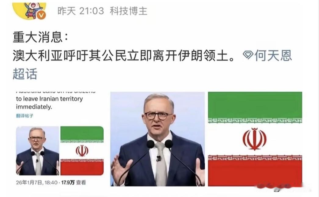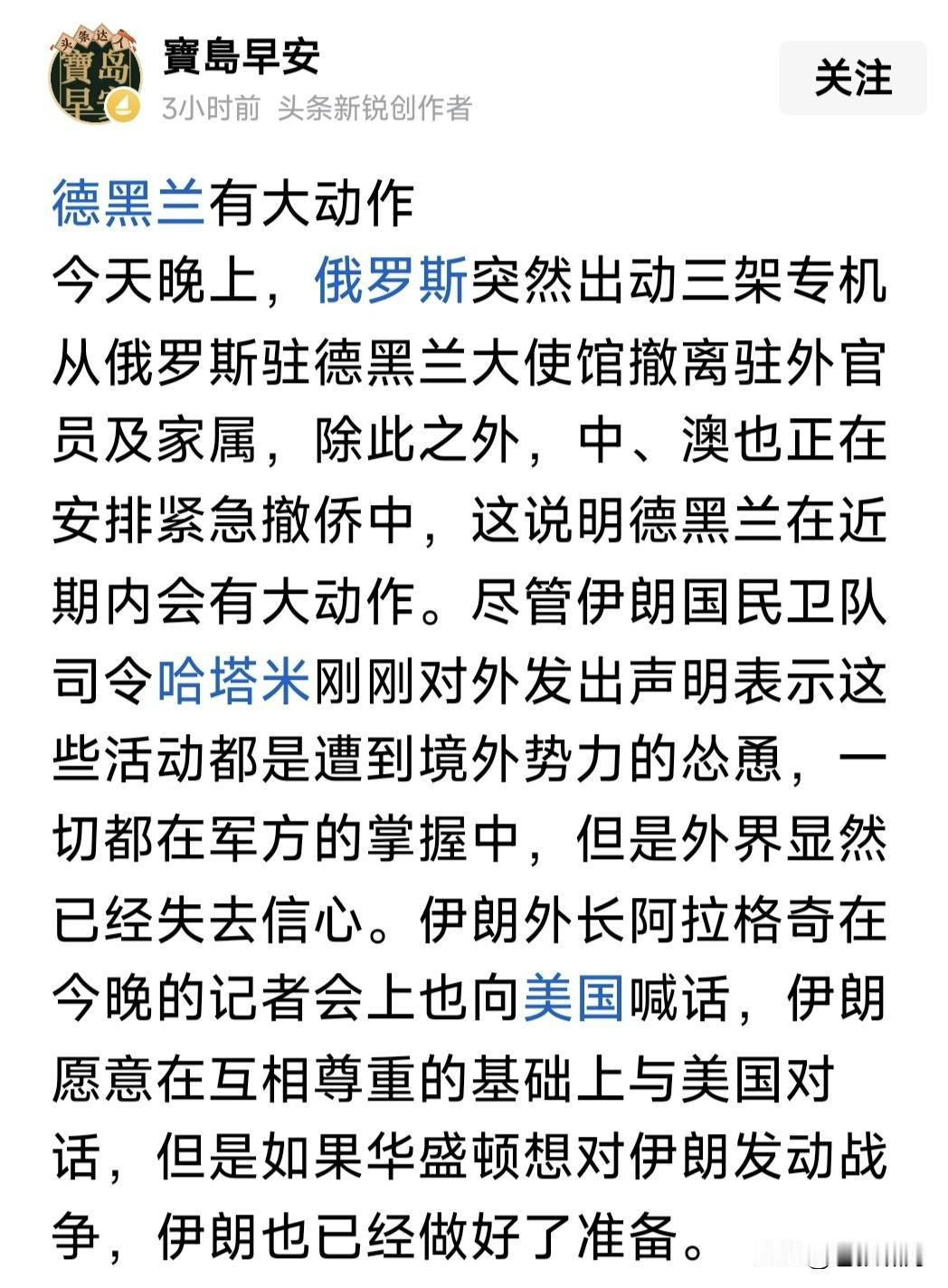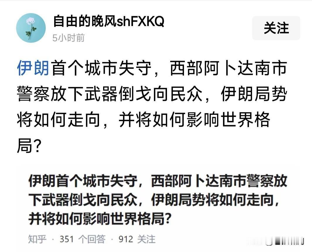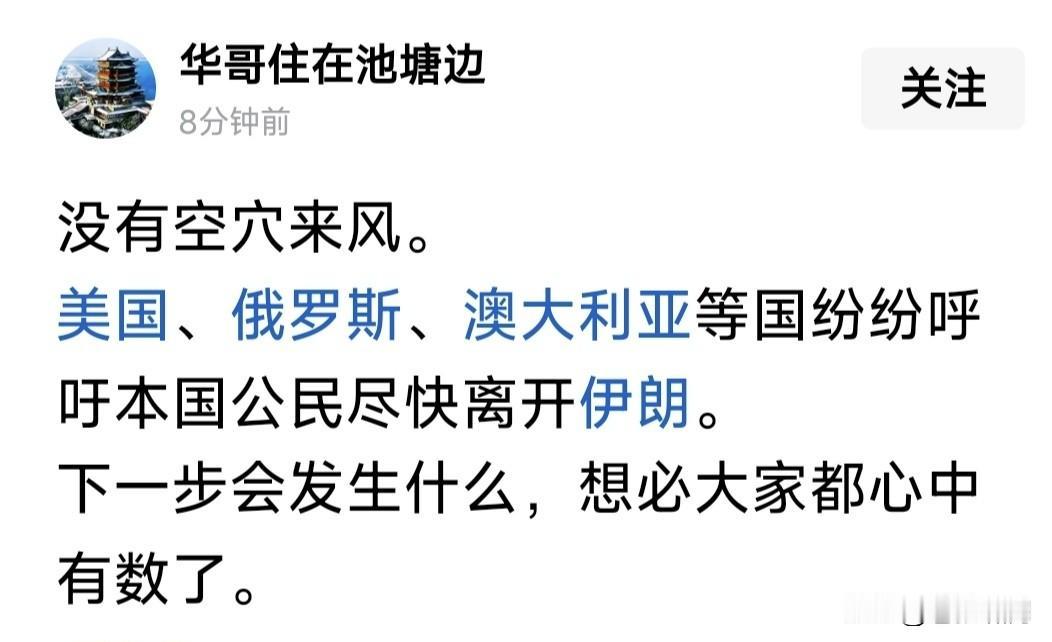 风雨欲来风满楼!各国从伊朗撤侨说明什么?示威愈演愈烈,警民冲突不断。阿卜达南市警察倒向民众。网络出现中断,马斯克接入星链卫星! 美欧宣布撤侨!中澳通知撤侨!连俄罗斯也出动飞机,接走驻伊朗外交官以及家属。这是因为什么?有消息称,美以将对伊朗发动新一轮打击! 若消息属实,事情很严重!上次美以联手打击,已使伊朗军事能源工业,尤其核研发设施,遭受严重损失。如果再次攻击,将摧毁伊朗核能力! 综合伊朗局势,美以想火上浇油,促使哈梅神权崩溃?自从推翻巴拉维,经历霍梅与哈梅两代神权,伊朗人民似乎醒悟,他们想要的并未实现! 世界文明浩浩荡荡,文明法治无法阻挡!即使暂时曲折迂回,也会跨越险滩铿然向前。这是中东神权最后堡垒,云开雾散,伊朗将阳光灿烂! 我们谴责美以可能对伊朗发动攻击,这是对主权国家的侵犯!但从另一角度思考问题,伊朗未来由谁决定?应该不是几个人,而是伊朗人民吧! …………
