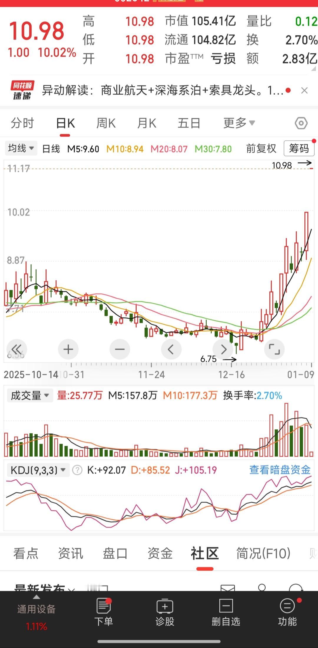今天又吃了10厘米,有人说我靠运气,其实运气成分固然要一些,最关键的还是靠技术!我记得昨天说了,买股票一定要买上涨趋势的股票,特别是那种沿着5日线攀升的股票,一旦回头就是黄金坑,后面有着无限可能。买股票千万不能买那种下跌趋势的股票,即使在牛市这种股票也要亏钱,因为趋势一旦形成要短期扭转是很难的,他要一个长期震荡慢慢消化的过程。当然了,买股票第2个原则要看量能和换手率,量能和换手率高代表关注的人多,参与的资金量自然就大,股票也就最容易起来!全市有近5000只股票,不可能雨露均沾每只股票都被所有人关注到,能成为牛股的只有少数中的少数。一只股票如果没有人气,就算它的质地再好短期也是涨不起来的,一般的散户你也不可能长期去等,你不可能一只股票一放就是一年两年。炒股好多年慢慢摸索到了一些门道,现在分享出来了给我们一些刚入门的新手,希望大家能少走一些弯路多赚一些钞票!!