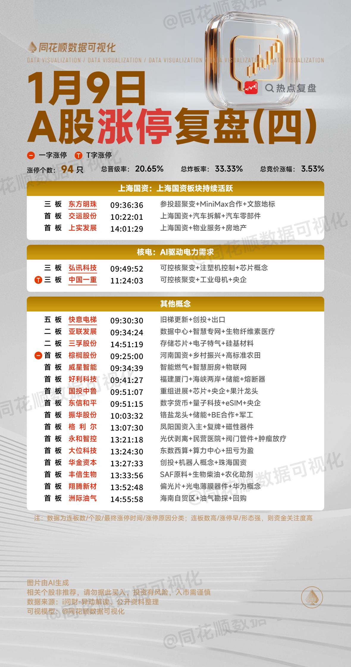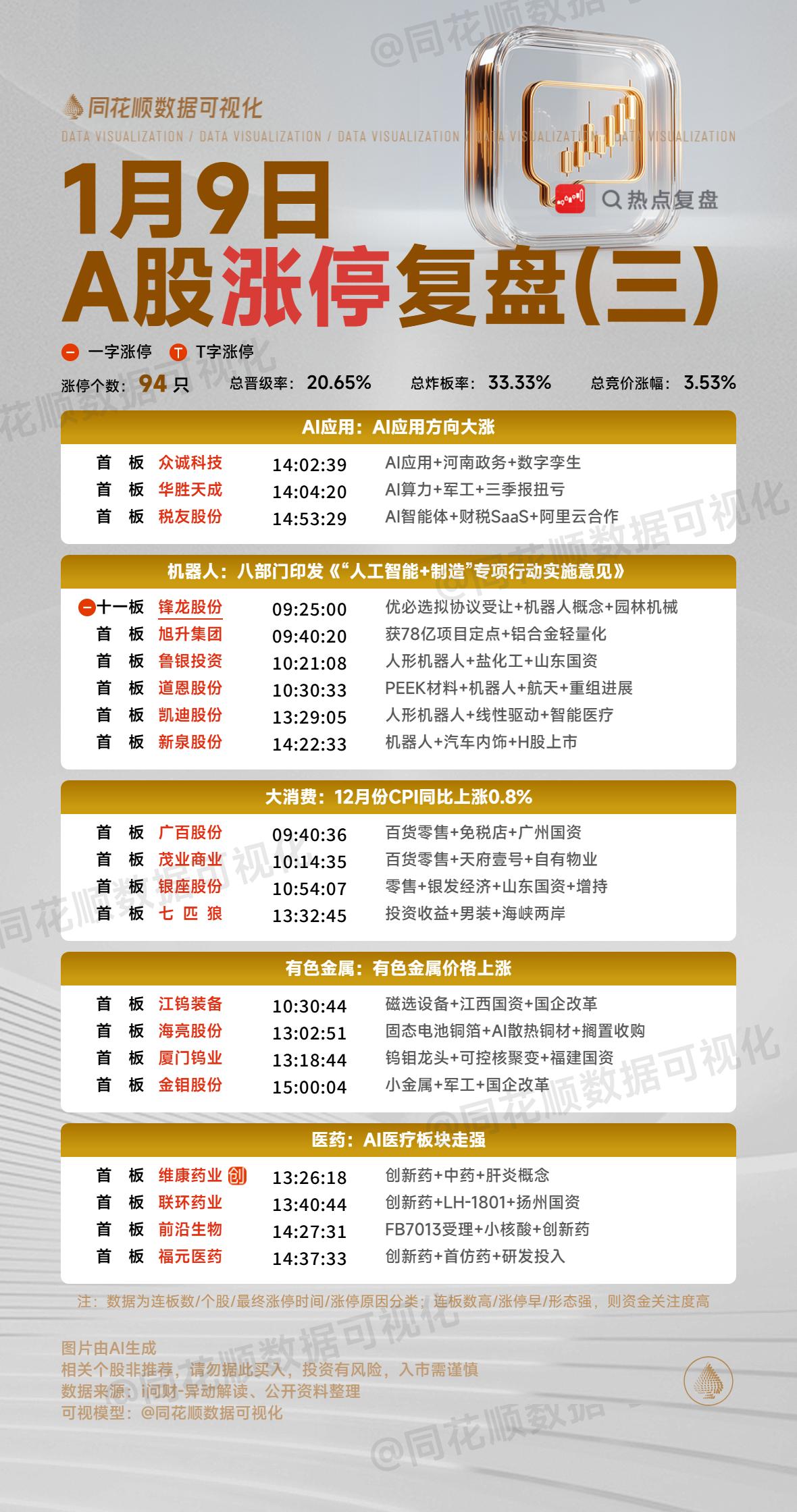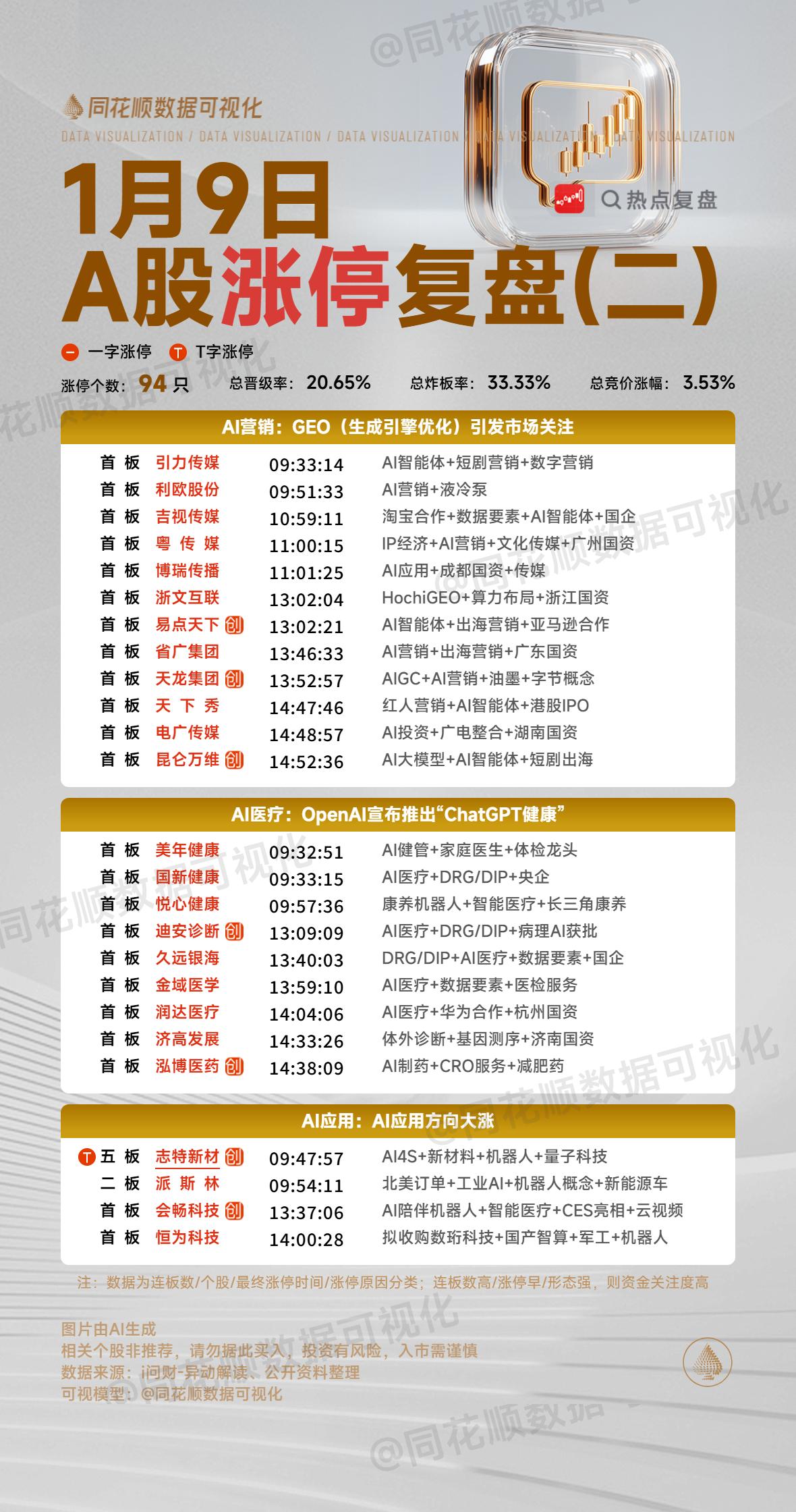 1月9日复盘:金风科技、雷科防务、通宇通讯、利欧股份、创新医疗隔日走势的一些看法! 1、金风科技(商业航天) 金风因为小群的介入早盘竞价超预期涨停价开盘,再加上开盘后整个商业航天方向不弱,所以它顶住分歧后是有明显资金承接封死涨停的,盘中随着大盘的突然跳水,金风也出现明显炸板,但是很快有资金承接回封,之后大盘持续没有起色,金风也出现反复分歧,午后在大盘企稳拉升时有资金再次强势封死涨停,最终走出了强势4连板的形态! 盘后的龙虎榜徐晓、中山东路、作手新一和消闲派的豪华游资榜单进场接力,卖盘知春路止盈,重庆解放碑做T,陈小群选择格局,这个榜单是非常强势的,市场几乎所有大游资开始抱团炒作金风,这样的情况下隔日至少会有冲高表现,再加上整个商业航天继续高潮,在隔日早盘出现一阵上冲的概率还是非常大的,但是金风毕竟已经走出4板了,而且商业航天连续两天出现高潮表现后是有回调需求的,那么隔日金风大概率会走出类似卫星、卫通似的断板走势,之后只要商业航天方向能够持续,它或许还会有趋势上行行情! 2、雷科防务(商业航天) 雷科早盘预期类的低开调整,但是它却是能持续维持在分时均线之上,这样的表现是非常强势的,盘中跟随大盘出现了一定下杀,但是午后再次跟随商业航天的高潮大涨,特别是最后阶段依然出现明显抢筹,最终还是收在严重异动之下! 盘后的龙虎榜消闲派继续加仓维护,深股通也是大幅净买入,其余上榜资金基本上是做T的机构,这样的榜单还是非常不错的,雷科毕竟依然还有严重异动在,所以虽然商业航天非常强势,但是资金依然很克制,而且隔日依然面临严重异动,这对于雷科来说继续强控可能会是常态,而商业航天的整体强度会影响到雷科是趋势上行还是趁势调整,总之,对于雷科来说,它这样持续的走势下肯定会有一波鱼尾行情,就是不知道是首阴后再次强势反包还是在控完异动后再次出现一次涨停板! 3、通宇通讯(商业航天) 今天通宇尾盘控异动更为经典,集合竞价成交14.4亿的情况下正好把严重异动压住,这样的表现跟之前航发压异动那次太像了,而且通宇同样这次压制住严重异动后,隔日就算涨停也不会有异动,这就是非常惊艳的表现了! 通宇今天没有龙虎榜,但是从昨天的三日榜看,江苏路、作手新一等强势资金进场接力,再加上一直引导的陈小群,做多通宇的大游资是非常多的,而今天14个亿压异动的表现肯定是大资金有意为之,这也是为了通宇之后的走势更健康,毕竟一旦严重异动,至少短期内很容易出现大的负反馈,所以对于通宇来说,隔日是可以高看一眼的,但是板块会不会共振跟随决定了通宇今天的压异动是不是无用功! 4、利欧股份(AI应用) GEO(生成引擎优化)引起市场广泛关注,这也带动了今天整个AI应用的大爆发,利欧在早盘跳空高开的情况下迅速出现资金强势封板,虽然盘中出现了炸板放量,但是很快再次出现资金承接封死涨停,走出了一个非常强势的缩量突破涨停板! 盘后的龙虎榜中山东路、中泰科苑南路、中泰深圳分都是大幅买入,另外两个买盘是深股通和机构,卖盘多为散户席位,这个榜单是超强的,而且今天整个AI应用方向是超强的,前期强势中军标的蓝色也是大幅拉升,所以在板块整体强势的情况下利欧是很有可能走出持续性,不过它今天是明显的缩量形态,隔日不开一字板的话抛压就会非常大,所以对于利欧来说,隔日竞价不一字开盘反而要小心下杀的风险,而接力的话更多的可以关注放量后的承接晋级! 5、创新医疗(脑机接口) 早盘竞价脑机接口整体是偏弱的,毕竟昨晚美股脑再生科技出现了大幅负反馈,这对于今天整个脑机接口都产生了非常大的影响,创新在开盘后是从4只4板个股中脱颖而出的,在顶住分歧后顺利强势封死涨停,本来这样的形态非常不错,但是随着大盘的跳水,它也受到了影响炸板,虽然承接一直不错,但是午后商业航天的爆发还是分流了大部分资金,创新反而最终差262万没有封死涨停! 盘后的龙虎榜深股通净买入近3亿,建设三路进场接力,翔鸽路做T,一个机构买入1.1亿,卖盘前期的几个获利盘兑现离场,值得一提的是温州帮尾盘竞价砸出1400万,是最后没有封死涨停最大的原因所在,但是考虑到它今天买入也有近3千万,那么这一砸可能是有意为之,毕竟今天创新就算封住涨停,同身位5板也是弱于银河和快意的,特别是银河还是商业航天方向最高标,那么隔日竞争力明显偏弱,而炸板后虽然有预期差,但是从今天接力的筹码结构看,全天几乎都是高位接盘的资金,再加上创新今天实际换手达到了53%,是有充分换手的,整体大幅获利盘其实并不多,隔日一旦脑机接口修复,反而更容易分歧转一致,所以对于创新来说,隔日并不用太过于悲观,或许盘中依然会有大幅冲高机会! 本文只限于分享和交流,不构成投资建议,股市有风险,投资需谨慎!