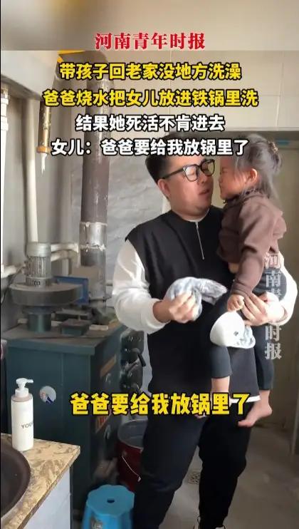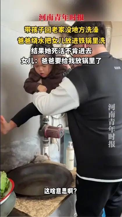父女铁锅洗澡视频引热议,真相竟是摆拍?背后原因让人哭笑不得。有观点称这是夫妻故意摆拍,目的是吓唬女儿,同时博取流量关注。 过去东北农村天冷,不少人会在家烧热水,让孩子站在锅里洗澡取暖,现在的孩子没经历过,容易误会。视频里的家庭墙上有取暖炉,父女穿着单薄,室内温度不低,孩子还穿着毛衣毛裤,显然不是真洗澡,当个乐子看就好。 网友评论 这不就是妥妥的摆拍嘛,为了点流量啥招都想得出来。 笑死,现在的小孩哪见过这阵仗,不得以为爸妈要把自己炖了。 想起小时候在老家,冬天洗澡真的蹲过大铁锅,满满的回忆啊。 有取暖炉还搞这出,纯属博眼球,没啥意思。 人家就是拍个搞笑视频,没必要上纲上线,看个乐呵得了。 这爸妈也太会整活了,换我家孩子得吓哭。