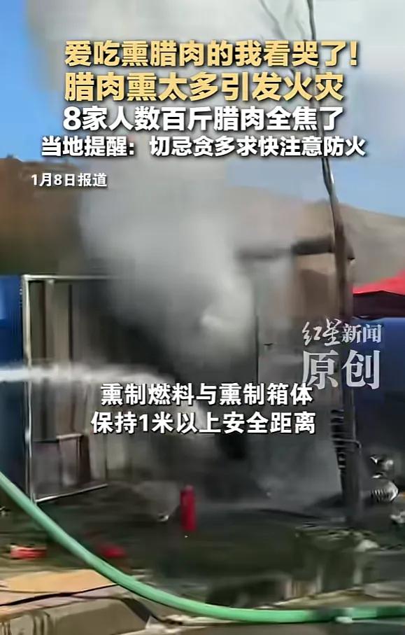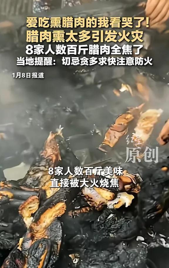 悲剧还是发生了!1月6日,四川南充,8户人家在熏腊肉时,为了快一点,就把数百斤腊肉都放进了熏腊肉的设备里面,结果因为太多腊肉滴油,导致设备突然起火,腊肉全被烧焦,一眼望去全是残骸,让人非常心疼。网友:爱吃腊肉的我哭了! 烟熏腊肉本身就是小火慢熏的工艺,至少得一个月时间以上。这种急熏火燎制作的,第一没有发酵的时间过程,第二没有草木香味渗透的时间过程,根本做不成那个腊香味,所以现在网上买的腊货只有烟熏味没有腊香味,风评普遍很差。 二十年前我在老家曾经也遇到过类似的事情,幸亏发现及时,才没有引发比较大的火灾事故。所以说熏腊肉一定要注意防火。 网友表示:我们湖南每年都有因熏腊肉发生的火灾,建议有宅基地的农村家庭修建专门熏腊肉的房子,避免在家里生火。 有次看见超市货柜上摆放的熏腊肉看着好好吃的样子,可回家烹饪后简直无法吞下去🤦那叫一个咸呐👍从今往后不买熏腊肉了!没有过去的味道,外面硬,里面稀烂,熏的过急,难吃死了,这两年买了有六百多元的熏腊肉,煮熟了吃不成全扔了! 我也是看网上做的腊肉菜很好吃,买了两条,结果煮了半天也不软,后来又拿高压锅蒸,皮还是不软,最后把皮去掉,才能炒菜。 网友表示:腊肉要先水泡一晚上,看个人口味清淡泡时间长短和中间换水,直接煮肯定不行,外卖的腊肉盐更重,不然放时间长就坏了。🤦🤦🤦 现在超市很多腊肉都不是柴火熏的了。都是加料侵泡最后在烘房烘干的。难吃的想吐。你想,这么多超市卖。那个柴火能熏的过来吗?要好吃要么自己熏,要么到农村农家亲自去买。