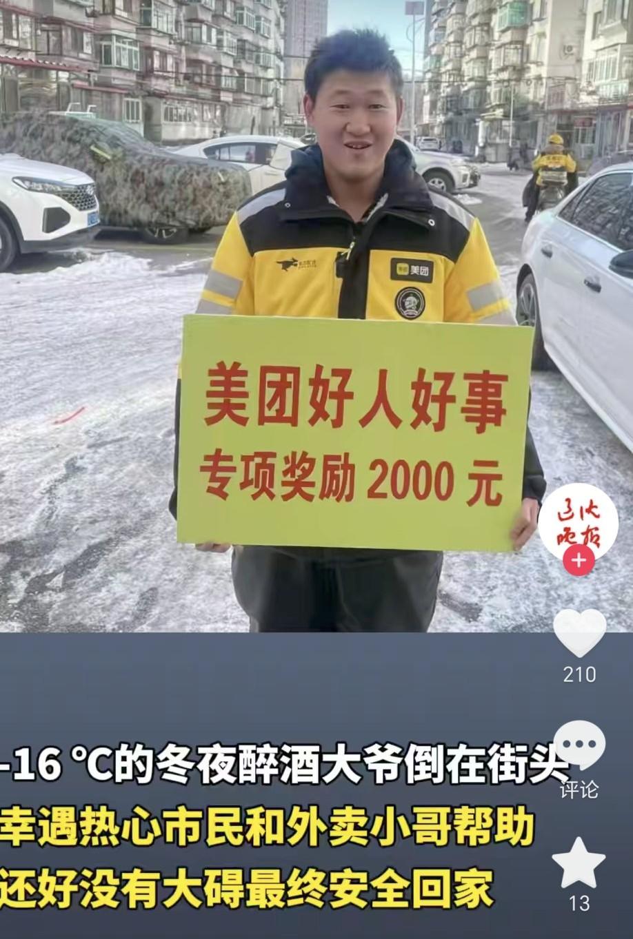 近日,在辽宁抚顺送外卖的美团外卖员李春雷在-16℃寒夜救助醉酒倒地大爷引起了热议。 当大家看到有人摔倒了,还在犹豫扶不扶的时候,他看到大爷趴在地上后,也顾不上送外卖挣钱了。而是第一时间过去查看情况,然后与路过的热心司机合力扶起并照看,然后司机报警,警察也是迅速赶到现场 。最终老人安全的回了家。 零下16度的天气,如果外卖员和司机没有介入,在老人醉酒的情况下,大概率会有生命危险,可以说李春雷这是救了老人一命。 美团知道这件事后,不仅授予“先锋骑手”称号,颁发荣誉证书 以及 纳入美团“好人好事”激励计划,作为平台正能量案例推广 ,还发放2000元现金奖励,表彰其极寒天气救助醉酒大爷的善。 据了解去年美团宣布设立好人好事以及见义勇为奖来奖励骑手们,最高可以获得10万元现金奖励,用制度托举善意、提升骑手价值、反哺平台生态、共建城市文明,形成“骑手-平台-社会”的正向循环 。