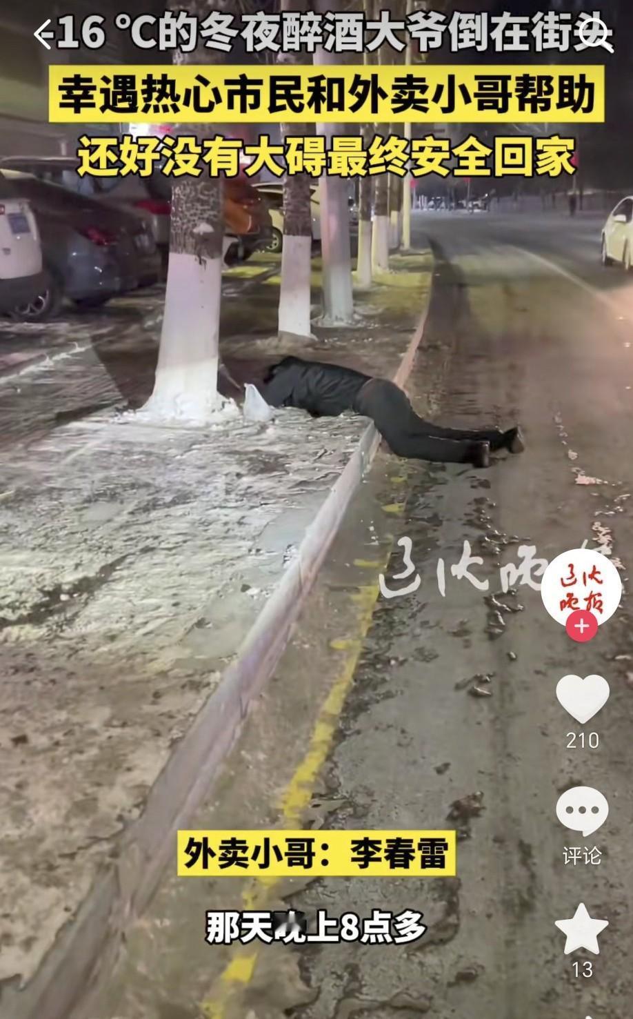 近日,在辽宁抚顺送外卖的美团外卖员李春雷在-16℃寒夜救助醉酒倒地大爷引起了热议