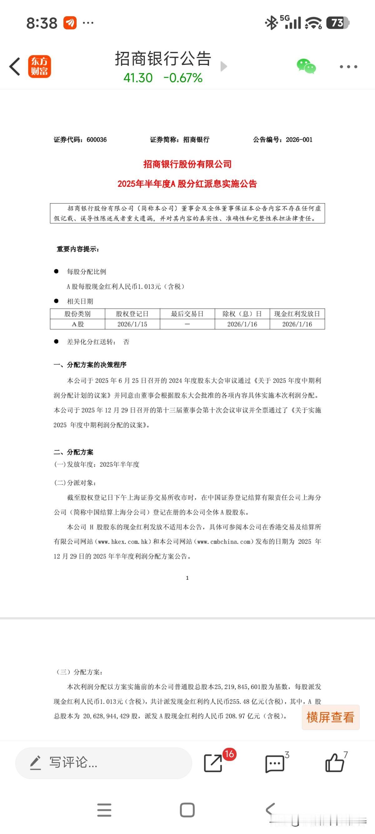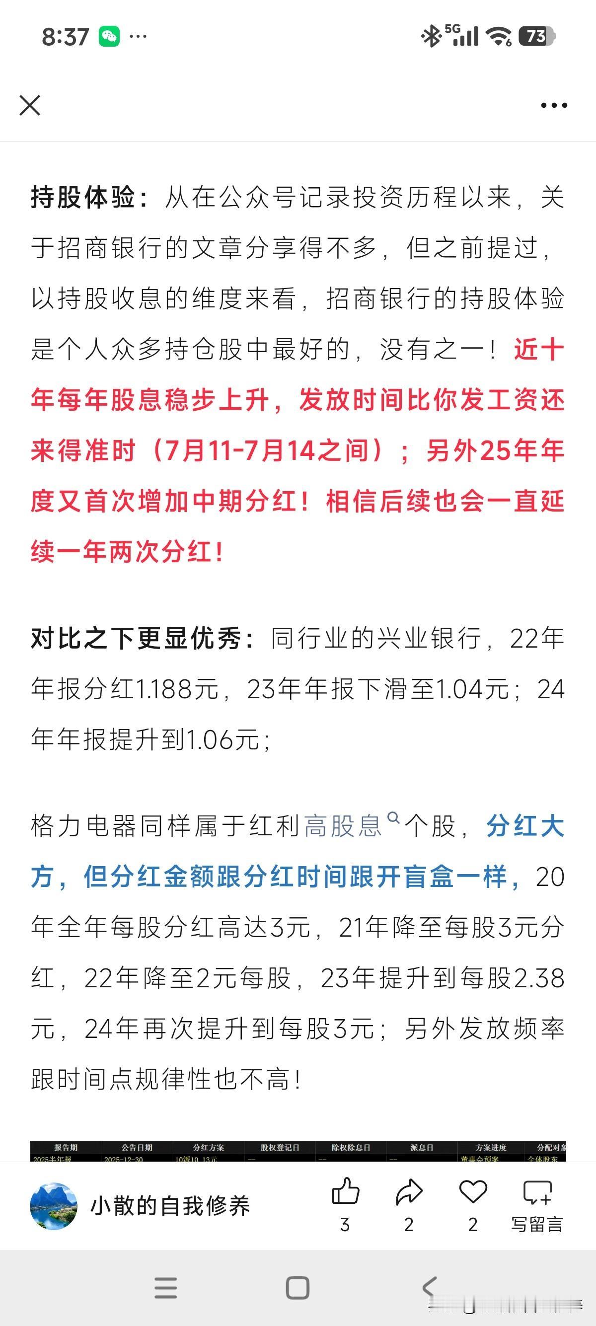 中期1月15日就能到账了!大概率也是26年收到的第一笔股息! 下午刚在某平台上写到,从持股收息角度来看,招行是最优秀的,每年股息只增不减,发放时间又准时!现在又开启中期分红先例!相信之后会延续一年分两次惯例,1月一次,7月一次[呲牙]! 除权后股息率又达5%以上了!复投计划再次开启!