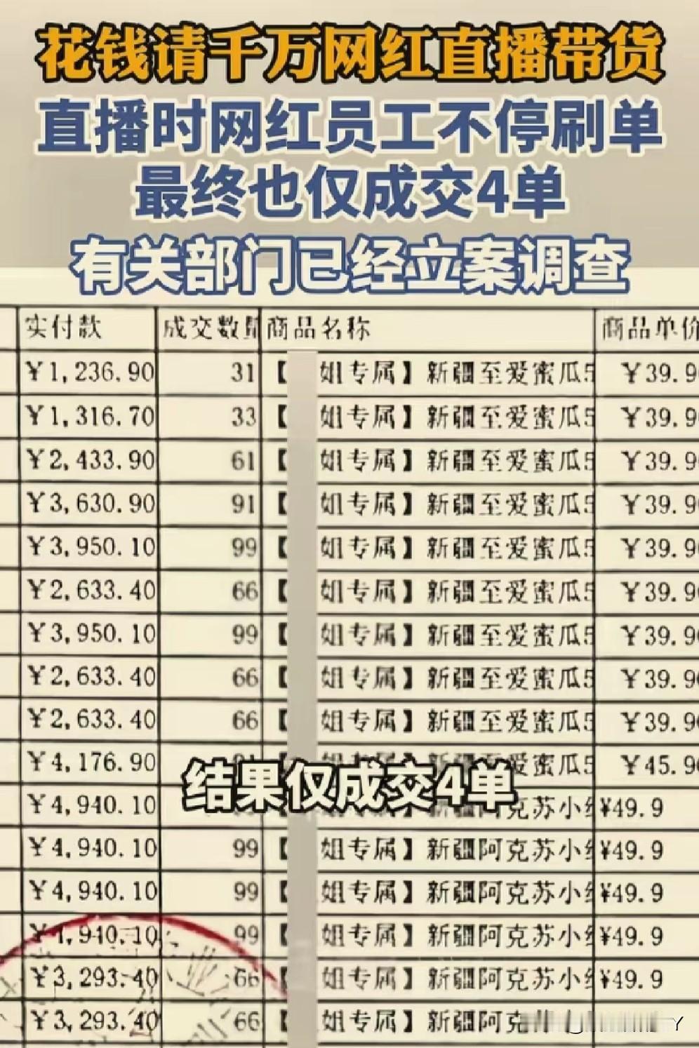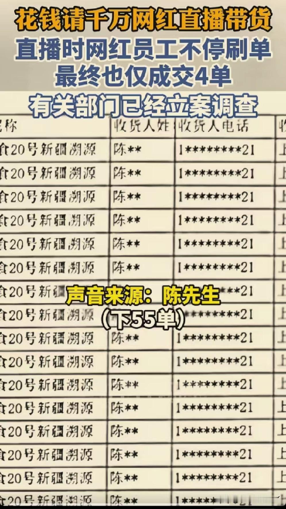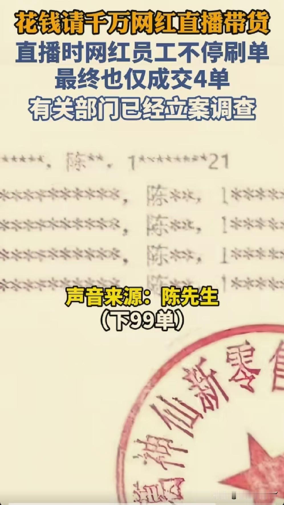 上海的陈先生做食品销售工作,为了提高销量,不惜花费重金邀请拥有1400多万粉丝的网红“姐爱美食”进行直播带货。 他本以为能借助网红流量打开销路,可没想到直播拼场仅20多分钟,直播间虽显示下了599单,但最终真实成交的却只有4单。 复盘时,陈先生发现大量订单未付款,存在严重的刷单现象,仅网红公司一名工作人员就刷了141单,还有员工下单后不付款。如此虚假繁荣,让陈先生的投入打了水漂。 气愤之下,陈先生果断报案,上海市宝山区市场监督管理局已对此立案调查。 这种刷单造假的行为,不仅欺骗了商家,还使消费者对直播带货的信任度大幅降低。 希望相关部门能严肃处理,还直播带货行业一片清朗,让真正用心做产品的商家不再受此歪门邪道之害!