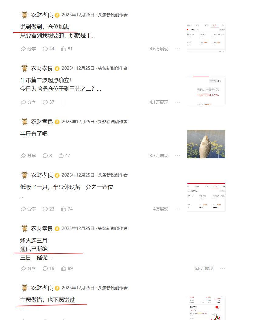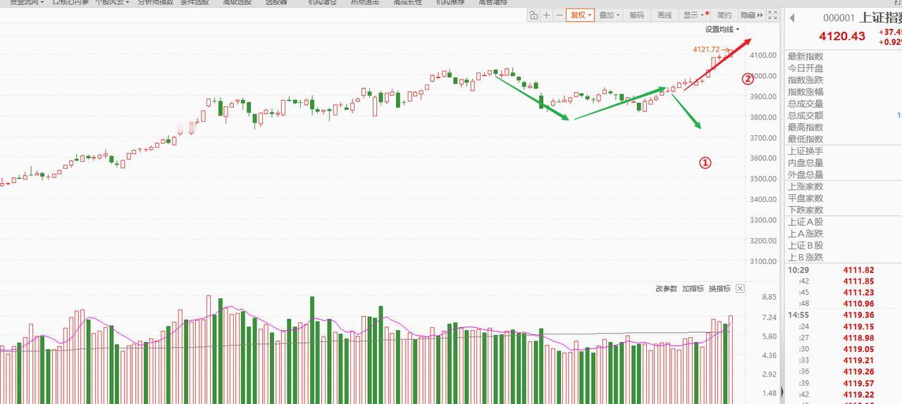 这波行情的反思,为何会在中途错判趋势! 指数在4034的时候,明确提出了中期顶部,调整的底部区间是3750±50点。 实际底部是3815,比最好的预期3800略高一些。 在实际运行的过程中,在3815之前都没问题,就是调整周期,很多人在3815之前的那一个月亏损较多。 但是在3815之后连续16连阳。 在6连阳之前,我认为就是下跌中继的反弹,要走出①的走势, 但在第7天的时候,我转多了,原因是平均价指数创出了新高,那么4034的调整只能看成上涨中继的震荡,只不过调整时间和力度比一般的大。 第7根阳线的当天早盘冲高跳水,随后反V。这里有一个重要信号,那就是易中天跳水,其余反而上涨,早盘冲高4000多家下跌,跳水的时候下跌家数反而缩减到3000以内,说明易中天下跌激活了市场。那么调整结束,积极做多即可。 之前和大家说过,调整的目的是切换主线,然后进行牛市的第二波上涨,第二波的主线肯定不是第一波的。 当时确定了3900就是牛市第二波的起点 所以就要积极参与,寻找主线 12月25买入三分之二的仓位,隔天仓位加满。 在买入的时候就大家说了,宁愿做错也不愿错过, 就是因为主线确立了,错就是能力不行,该交学费 但一旦在逻辑内被认定,那就知行合一,干就是了。 所以不愿错过。 后来我看了一下为何扭扭捏捏趋势就反转了呢? 主要原因是人民币升值,导致增量资金涌入股市。 调整就是为了切换主线,进行牛市第二波的上涨。 所以一跌就有增量资金不断的进场,才有了最后末尾的下跌没有发生,直接被买上去了。 所以一说大家是不是更能理解了,我为何看上了商业航天,并且一直持有到现在, 基本可以维持到这个月底。 既然主线确立,1月又是上涨周期,那就拿着不动,下周还有上涨,然后震荡,到时候再考虑降降仓位,后面继续震荡向上,我就滚动做到月底,最后清仓等待下一个波段行情。
