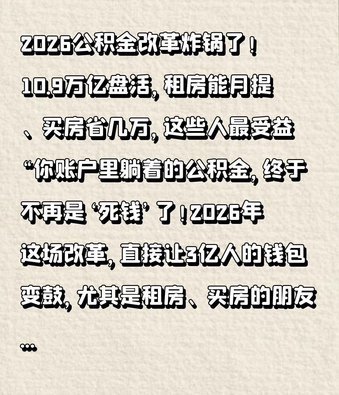 2026公积金改革炸锅了!10.9万亿盘活,租房能月提、买房省几万,这些人最受益 “你账户里躺着的公积金,终于不再是‘死钱’了!2026年这场改革,直接让3亿人的钱包变鼓,尤其是租房、买房的朋友,看完赶紧收藏!” 之前多少人吐槽公积金“食之无味弃之可惜”?全国缴存余额超10.9万亿,年利率才1.5%,跑不赢通胀就算了,提取还得跑断腿——广州网友为了交房租提公积金,跑了三次补了一堆材料还没办成;异地工作的人换城市,账户余额就成了“沉睡资金”,想用都用不上。 但2026年新政一落地,直接颠覆认知!先看买房人狂喜的福利:公积金贷款利率再降0.25个百分点,5年以上首套利率低至2.6%,贷款70万贷30年,利息直接省3.3万,相当于白拿一台家电套装。沈阳更给力,首付比例15%政策延长到年底,“商转公”比例从60%提至80%,100万的房子剩余80万商贷,现在能全额转公积金,不用再背高息商贷了 。多孩家庭、新市民更吃香,云南三孩家庭贷款额度上浮30%,沈阳新市民买二手房,贷款限额也能提至1.3倍 。 租房党也迎来春天!北京试点公积金直付房租,零材料申请,每月自动打钱给房东,再也不用先垫钱再报销;石家庄多子女家庭年提上限飙到2.4万,房租压力直接减半 。更惊喜的是,使用场景大扩容:徐州、沈阳能提公积金交物业费,广州支持老旧小区加装电梯,成都甚至把重大疾病医疗费用也纳入提取范围,公积金从“住房专用金”变成了“家庭备用金”。 不过网友争议也很激烈:有人喊着“为啥不能用公积金交学费、买车?”,也有人吐槽“线上秒批是噱头,提物业费还被打回要补证明”。其实这次改革已经进步巨大,灵活就业人员也能缴存了,天津、宜昌把个体户、自由职业者纳入体系,还能享受商转公福利 。 说到底,公积金是咱们打工人的血汗钱,改革的核心就是让“死钱变活钱”。从异地通办、流程简化到场景扩容,每一项调整都戳中民生痛点。现在各地政策还在细化,赶紧查下你所在城市的新规,别让自己的福利白白浪费! 你觉得公积金改革还该优化哪些地方?欢迎评论区聊聊,也转给身边正在租房、买房的朋友,一起享政策红利!