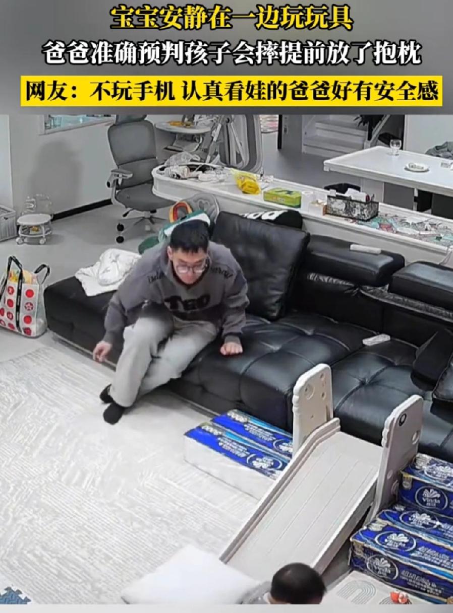 这才是好爸爸!值得所有人学习! 江苏,一宝宝安静在一边玩玩具,爸爸没有玩手机,虽然坐有点远但一直观察着宝宝,预判宝宝会摔,提前放了抱枕。没想到,几秒后,宝宝准确躺在抱枕上。 爸爸看似松弛淡定,实则手拿把掐。肯定平时常常带孩子,了解孩子的习惯,才能提前预判出会发生什么。 我可以说,一个看孩子不玩手机,又全程关注孩子的爸爸,实在太难得了!很少爸爸能做到他这样子。 现在的人似乎中了手机毒一样,手不离机,机不离手,有事没事刷刷视频。即便带孩子,很少爸爸能做到他这样子,看孩子不玩手机,又全程关注孩子。 这样的爸爸,孩子太有安全感了!为他点赞!