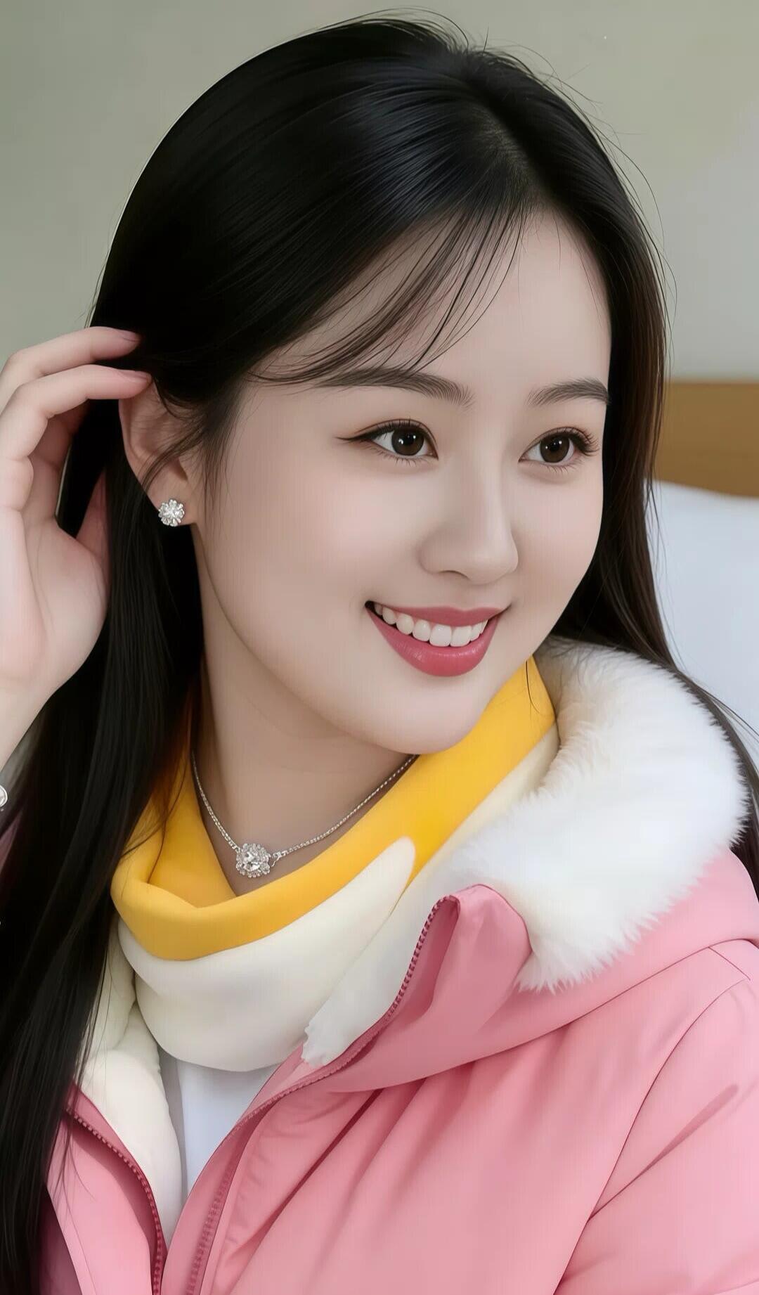 冬日暖阳下的甜美笑容,粉色羽绒服搭配闪亮耳环,元气满满!🌞💖