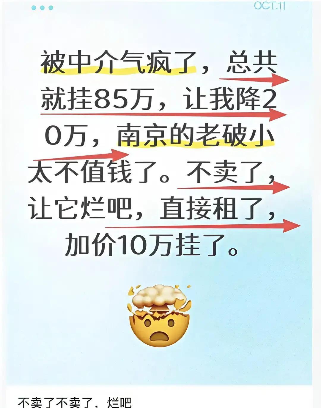 南京房东集体涨价这事儿刷屏了。 说是人才新政要落地,最高补贴三百万,公积金能贷两百万。 房东们连夜把挂牌价抬了十万到一百万不等,有人直接撤盘不卖了。 我刷到中介朋友圈都在发“再不买就晚了”,配图是仙林某盘售楼处人挤人。 可我去官网查了,住建局压根没发正式文件,央行也没说降息。 挂牌量确实降了三千多套,但贝壳说是年底正常波动。 现在房东分成了两派,想卖的继续降价,不想卖的干脆下架观望。 没官宣就别跟着起哄。 真有政策再激动也不迟,别被带节奏高位接盘。