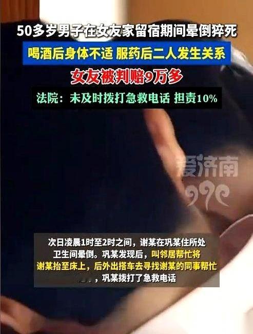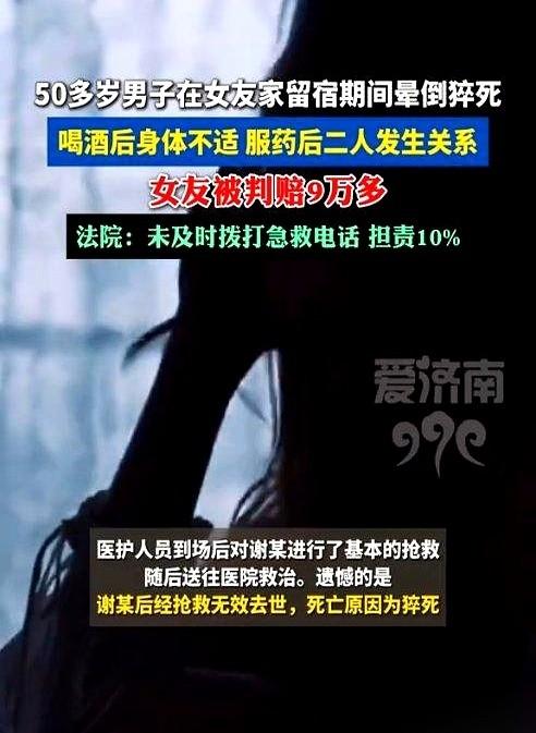五十多岁的大叔,在女朋友家,吃完胃药,喝了顿酒,然后俩人还滚了个床单。 故事的结局是,他死了。 就这么个事儿,听着都觉得憋得慌。 他倒在卫生间的时候,喘不上气,浑身发软。他女朋友当时是怎么想的呢?慌了,彻底乱了。 她没第一时间打120。 她先找了邻居,邻居能干啥?掐人中吗? 又打电话给同事……我真的不知道她指望同事能干嘛,电话里远程急救? 就这么折腾了快俩小时,黄金抢救时间,全在这些莫名其妙的电话里耗没了。等人送到医院,早就凉了。 法医一鉴定,心源性猝死。再一查,好家伙,这大哥自己本来就有严重高血压和脑血管病。 他这是拿自己的命在蹦迪啊。 家属不干了,一口咬定是女方耽误了,要赔钱。 女方也委屈,说他自己作死,关我什么事。 最后法院怎么判的?我觉得判得特别“人间真实”。 法院说,老哥,你自己身体什么情况没点数吗?吃药、喝酒、剧烈运动,死亡套餐三件套你全占了,90%的责任,你自己背。 然后又对女方说,但是,你作为当时唯一在场的人,眼看着人不行了,没有第一时间求助专业人士,而是找邻居找同事,这个操作确实离谱,耽误了哪怕一丝一毫的生还可能。所以,10%的责任,你得担。 最后赔了9万多。 这事儿说白了,就是一笔账。 激情是有账单的,有时候,是用钱来付。 有时候,是用命来结。