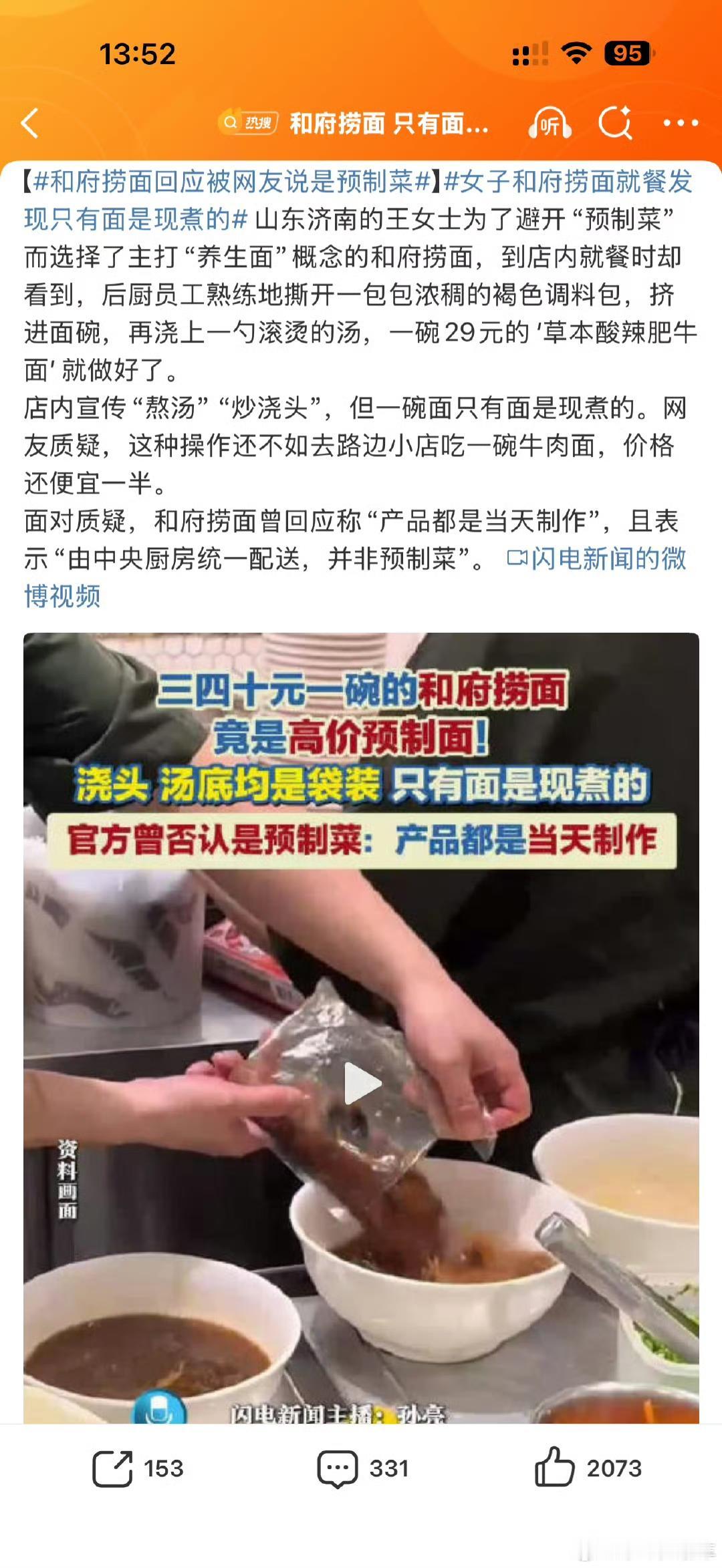 花三十多块吃碗面,结果只收获一把“现煮面条+两包热水”?和府捞面被这句大实话送上热搜:汤头和浇头全是料包,后厨像大型拆快递现场,白花花的塑料袋堆成小山,员工“呲啦”一撕,褐汤倒进碗里,再舀勺开水,一碗二十九元的“草本酸辣肥牛面”就端到你面前,全程不超过三十秒,比泡面只多一个煮面步骤。 消费者当场破防:我花近四十块,就为吃高配版“冲泡面”?有人吐槽“还不如路边十二块的牛肉面,起码人家真把骨头熬成汤”;有人调侃“原来书房里的养生面,指的是在书房拆料理包”;更有人把和府称作‘捞面界的速溶咖啡’——看起来香,喝起来像回公司加班。 面对“预制菜”质疑,品牌赶紧回应:料包都是“当天制作”,中央厨房凌晨发车,门店现拆现热,不算预制。网友不买账:当天打包的料理包就不是预制?那我把昨晚剩菜热一热也能叫“现炒”了?有人翻出官方旧广告,什么“匠心慢熬八小时”“老师傅现炒浇头”,如今全成PPT式宣传,和实际画面形成刺眼反差。 其实和府这套“去厨师化”流水线,本意是学西式快餐:统一口味、快速扩张。但问题是,你定位中高端,一碗面动辄三十五到五十元,却连灶台都省了,后厨只剩电磁炉+热水壶,消费者自然觉得性价比塌方。有自称员工的网友补刀:“店里连把菜刀都没有,肥牛卷解冻后倒袋即出餐,我上班像在做化学实验。” 眼看舆论压不住,和府去年悄悄在上海、苏州试水新店型,口号改成“现炒浇头”“锅锅现煮”,试图把锅气找回来。但业内人士透露,门店高峰期依旧来不及炒,大部分蒸点、配菜还是靠中央厨房配送,所谓“现熬骨汤”只是换个大桶加热,本质仍是“预制2.0”。 大家不是嫌弃料理包,而是讨厌被当冤大头。真要图快,十块钱买桶泡面自己加蛋也能吃饱;图口味,楼下夫妻小店明火炒浇头,二十块吃得热汗直流。和府把“效率”玩明白了,却把“价值”玩丢了——花三四十块,连口热汤都要靠复水,谁还愿意为一碗“拆包面”排队?毕竟,消费者的嘴不瞎,钱包更不傻。捞碗面 府捞面 来源:闪电新闻