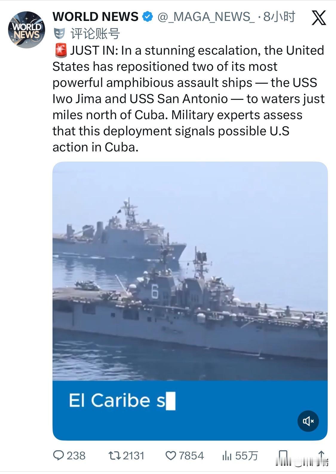 最新消息:美国采取惊人升级行动,将两艘最强大的两栖攻击舰——“硫磺岛”号和“圣安东尼奥”号——部署到古巴以北数英里的海域。军事专家评估认为,此次部署预示着美国可能在古巴采取行动。