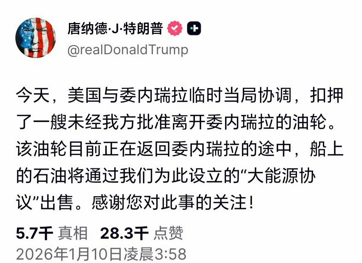 特朗普称是与委内瑞拉临时当局协调扣押的 特朗普发文:今天,美国与委内瑞拉临时当局协调,扣押了一艘未经我方批准离开委内瑞拉的油轮。