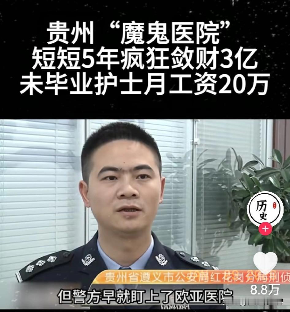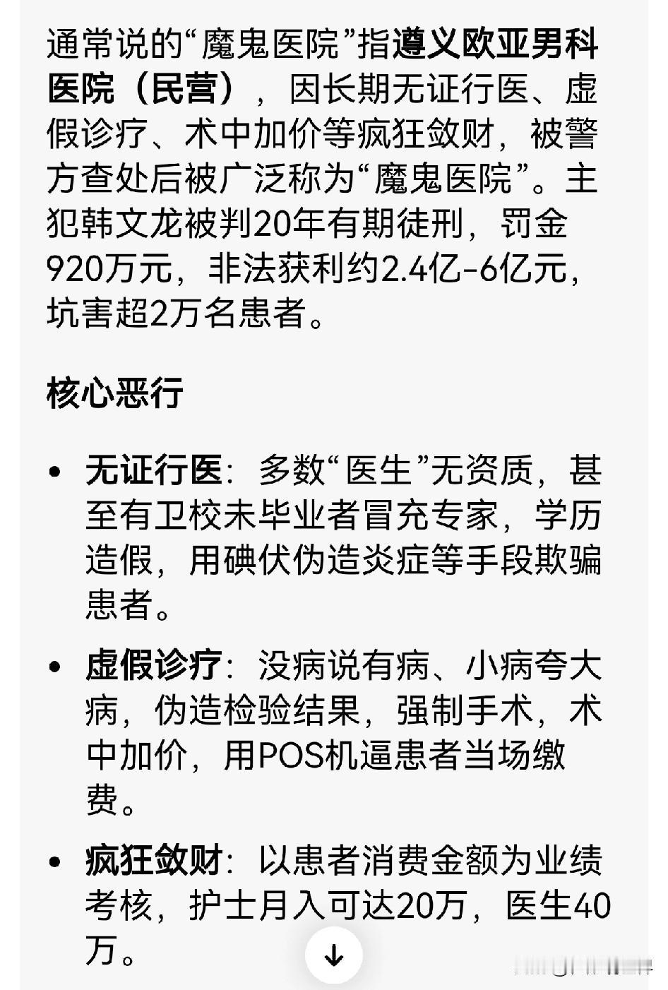 5年狂骗3亿!“魔鬼医院”用假医生、手术台加价宰患者,更可怕的是这两点 你敢信?贵州遵义一家男科医院,把手术刀变成“抢钱刀”,5年狂敛3个亿!给人开刀的“专家”是卫校没毕业的护士,月入最高20万;5岁孩子治个小毛病被坑2.48万,24岁小伙手术+“康复”花掉19万,病没好还落下后遗症——这哪是医院?分明是吃人的“屠宰场”! 更让人脊背发凉的,不是个别医护的黑心,而是整个骗局的“系统性”:网上用美女头像钓人,免费检查当诱饵;一进医院就用假报告吓你,说“不手术影响生育”;麻药打上、刀子划开,突然叫家属加钱,一句“转院出事不负责”逼你就范。员工有剧本、有培训,业绩只看“骗了多少钱”,从上到下把“医疗”变成了精心设计的“杀猪盘”。 可最该堵上漏洞的监管,却成了“保护伞”!15名相关干部被黑心钱腐蚀,患者的投诉举报全被压下。如果不是受害者忍无可忍实名报警,这个毒瘤还不知道要坑多少家庭。我们怕的从来不是生病,而是生病时要面对“趁你病、要你命”的骗局,怕的是“求助无门”的绝望——毕竟谁也不敢赌,自己会不会是下一个被宰的人。 你身边有没有人遇到过类似医疗乱象?如果不幸被黑心医院坑了,你会为了隐私忍气吞声,还是果断站出来维权?评论区说说你的经历或看法,让更多人擦亮眼睛!
