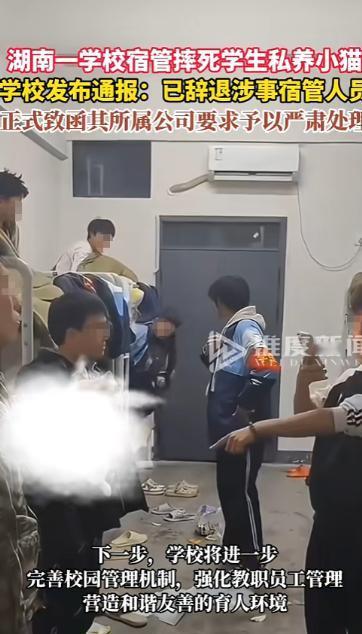 “严查到底!”12月15日,湖南湘西,一宿管查寝时,发现一名学生在宿舍私养小猫,在沟通中发生争执,随后学生不断用言语挑衅宿管,称有本事把小猫摔死,宿管被学生言语彻底激怒,狠狠将小猫摔在地上,导致小猫死亡。网友:太冲动了! 查寝那天夜里,天气格外冷,走廊里的白炽灯把男寝照得发白。宿管员推门进来时,一眼就看见床下角落里放着个纸箱,里面蜷着一只小猫,冻得直发抖。 宿管员皱着眉,当场开口:“学校明文规定,宿舍不让养宠物,你赶紧把小猫弄出去。” 男生站在一旁,有些着急:“我送它去外面,现在天这么冷,它扛不住的。” 宿管员语气变得严肃起来:“那就让你家长马上来接走。” 男生一听更急了:“现在都这么晚了,家里人也来不了,明天行不行?我就再放一晚上。” 宿管员摇头,指着宿舍里其他床位说:“宿舍这么多人,万一它咬到人怎么办?出了事谁负责?你负责还是我负责?” 这句话像是点着了火。男生觉得对方一点人情味都没有,情绪一下子上来,顶了一句:“不就是一只小猫吗?哪有你说的那么严重。” 宿管员脸色也沉了下来,语气明显强硬:“我也是按学校规定办事,我是给学校工作的,你别影响我工作。出事了,第一个找的就是我。” 周围的同学开始劝和,有人说先想个折中的办法,有人让男生别再顶嘴。可男生年轻气盛,觉得自己是在救猫,越想越不服气,嘴上还在嘟囔“太不近人情”。 班主任接到宿管电话后,很快赶到了男生宿舍。此时,宿舍走廊里已经围了不少学生,气氛明显不对劲。纸箱里的小猫被抱在怀里,缩成一团,不停地发出细小的叫声。 班主任先是了解了事情经过,随后试图缓和局面。他语气平静地表示,学校确实有明确规定,宿舍不能养宠物,但也不希望事情闹大,更不愿看到生命受到伤害。 于是他提出一个折中的办法:“这样吧,小猫我先带走,今晚我负责安置,等明天再联系救助站或者领养人。” 在场的同学听后,大多松了一口气,觉得这是目前最合适的解决方案。然而,出乎所有人意料的是,那名男生却情绪激动地拒绝了。 他认为事情已经闹成这样,再把猫交出去,心里憋着一股气,觉得自己被针对了。男生不仅不配合,反而开始用激烈的言语刺激宿管。 他当着所有人的面大声喊:“你不是嫌麻烦吗?有本事你把猫摔死啊!” 紧接着,又冷笑着补了一句:“不敢摔就是怂包!” 这番话一出口,现场瞬间炸开了锅。有人倒吸一口凉气,有人急忙拉住男生,让他别再说了。班主任也立刻严厉制止,要求男生冷静,强调任何人都不能伤害动物,更不能拿生命当赌气的工具。 宿管站在一旁,脸色由白转红,手不停发抖。长期以来,他承受着“出事就追责”的工作压力,而此刻又被当众羞辱、挑衅,理智在情绪的冲击下迅速崩塌。 在众人还没反应过来时,宿管突然冲上前,一把从学生手中夺过小猫。有人惊叫着喊“别这样”,有人下意识伸手阻拦,但已经来不及了。宿管高高举起手,将小猫狠狠地往地上砸去。 “砰”的一声闷响,整个宿舍楼仿佛都安静了。小猫落地后还在微微挣扎,身体抽动,发出几乎听不见的叫声。 现场的学生有的捂住嘴,有的转过身去不敢再看,班主任当场愣住,厉声喝止。 宿管并未停下。他似乎已经被愤怒彻底控制,又将小猫捡起,再一次重重摔向地面。这一次,小猫很快停止了挣扎,身体僵直,只剩下微弱的抽搐,最终彻底没了动静。 宿舍里一片死寂,随即爆发出哭声、斥责声,有学生情绪崩溃,有人当场质问宿管“你怎么下得去手”。有人将全过程拍了下来,视频很快在网络上传播,引发巨大争议。 事件曝光后,迅速冲上热搜。网友们愤怒不已,纷纷留言:“再大的矛盾,也不该拿一条生命泄愤”“这是赤裸裸的虐杀” “成年人情绪失控到这种程度,太可怕了”。也有人指出,学生的言语挑衅同样值得反思,但无论如何,都不能成为施暴的理由。 面对汹涌舆论,学校很快作出回应。校方表示,涉事宿管行为性质恶劣,已向学生及相关人员赔礼道歉,并第一时间解除其劳动关系,予以辞退。 同时,学校将加强宿舍管理人员培训,完善沟通与应急处理机制,避免类似事件再次发生。