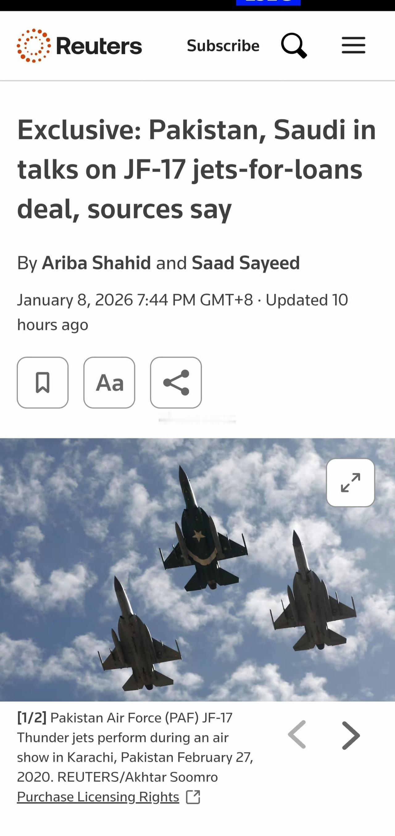 路透社1月8日报道,两名巴基斯坦消息人士披露,两国现在寻求进一步加深军事合作,讨论将沙特的20亿美元贷款转换为“枭龙”战斗机交易。 其中一名匿名消息人士称,相关讨论仅限于采购“枭龙”战斗机,预计交易总价值将达到40亿美元,其中20亿美元由沙特贷款转换而来。另一名消息人士则表示,沙特和巴基斯坦讨论了多种方案,“枭龙”战斗机是主要选项。