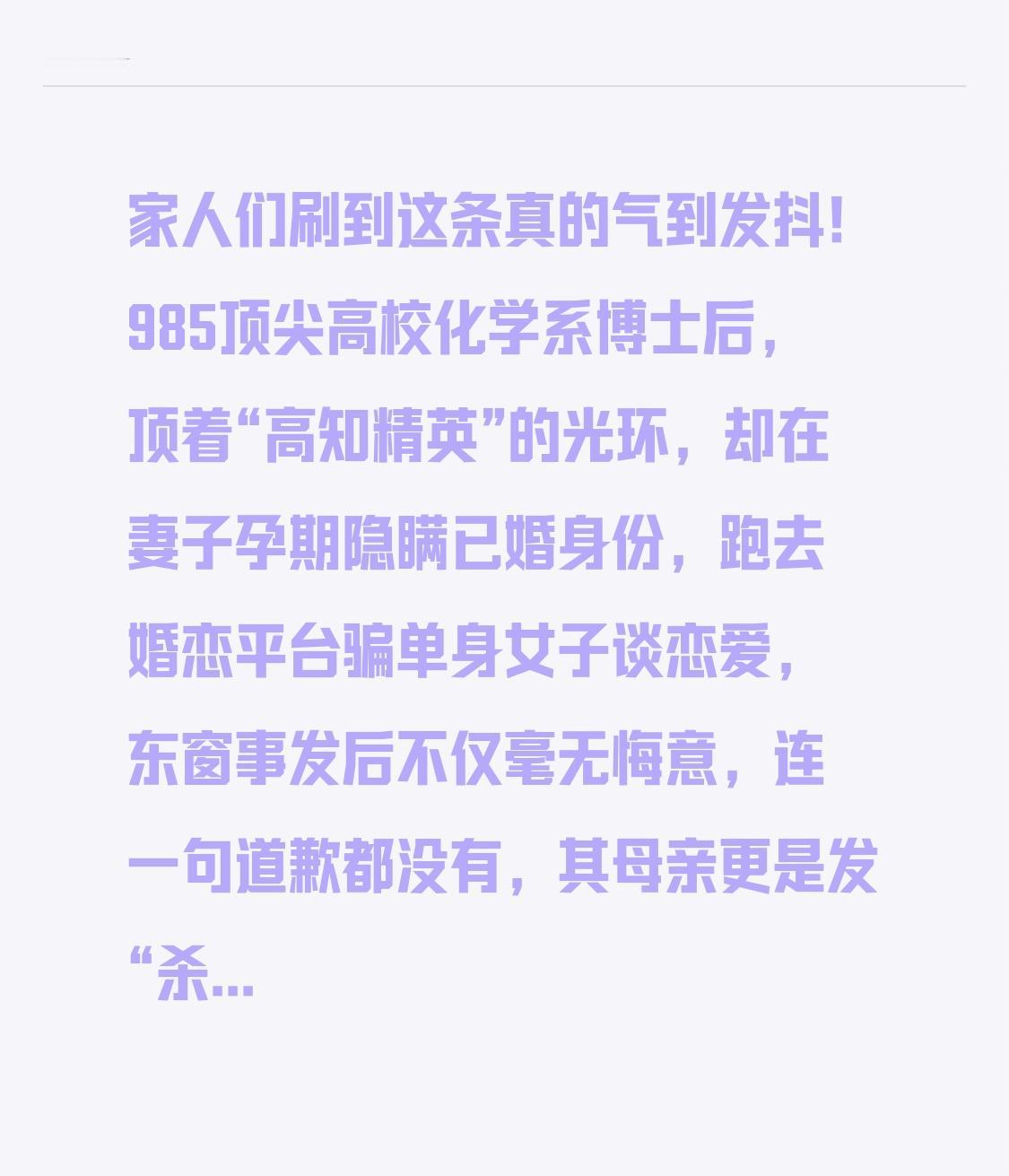 在妻子孕期出轨博士后未给女子道歉 家人们刷到这条真的气到发抖!985顶尖高校化学系博士后,顶着“高知精英”的光环,却在妻子孕期隐瞒已婚身份,跑去婚恋平台骗单身女子谈恋爱,东窗事发后不仅毫无悔意,连一句道歉都没有,其母亲更是发“杀杀杀”的威胁短信恐吓受害者!这波操作简直颠覆三观! 事情要从2024年说起,莫女士在婚恋公众号上公开征婚,明确要求对方“未婚、有结婚打算”,91年出生的博士后聂某某主动联系她,亮出“985博士+博士后”的光鲜履历,温柔体贴地展开追求,两人很快确定恋爱关系,每周至少见面一次。 莫女士怎么也没想到,自己以为的良缘,竟是一场精心策划的骗局!2025年3月,她偶然翻看聂某某的手机,发现他和母亲的聊天记录里全是婴儿的照片和视频,聂母还叮嘱儿子“把小宝贝照顾好”。顺着线索深挖,莫女士彻底崩溃——聂某某加她好友时,妻子正处于孕期,两人恋爱期间,对方的孩子都已经出生几个月了,而他微信里给妻子的备注竟是“老板”,就为了掩人耳目。 对峙时,聂某某只轻飘飘说一句“一时糊涂,觉得你好看温柔”,把底线和道德全抛在脑后。更让人心寒的是,莫女士维权至今近一年,从没想过要报复,只求一句真诚的道歉,可聂某某始终沉默,甚至换了地方继续从事科研工作。 而这场维权之路,远比想象中艰难。莫女士本科学法,却还是靠网友建议才敢起诉,起初找的律所都不建议立案。她实名举报后,学校虽作出退站处理,取消其评优、职称申报资格24个月,可聂某某的母亲张某某竟发来“把你除掉”“杀杀杀”的威胁短信,警方最终仅对其罚款200元。长期的精神折磨让莫女士患上抑郁和焦虑,医生建议住院治疗,甚至有了自杀的念头。 最讽刺的是,聂某某作为接受高等教育的博士后,本应是社会道德的标杆,却连最基本的忠诚和担当都没有。他欺骗的不仅是莫女士的感情,更是婚姻的契约精神,践踏的是女性的合法权益。《妇女权益保障法》明确规定,妇女的人格尊严不受侵犯,可现实中,受害者维权却要付出如此惨痛的代价。 其实大家愤怒的,从来不是学历高低,而是高知光环下的道德双标。知识应该用来修身立德,而不是包装自私与虚伪。婚姻的底线是忠诚,做人的底线是善良,无论学历多高、成就多大,一旦突破道德红线,就不配得到尊重。 希望莫女士能早日拿到那句迟来的道歉,也希望所有女孩都能擦亮眼睛,更希望法律能真正成为弱者的后盾。你怎么看待这场“高知出轨零道歉”事件?评论区聊聊你的看法,点赞转发,让更多人关注女性维权困境!