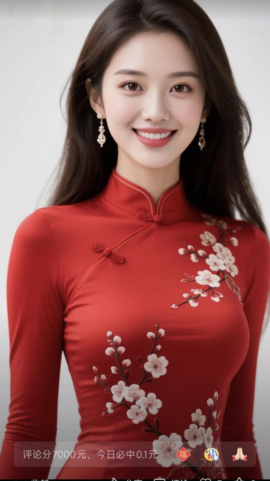 山坡羊·红袍佳人 红袍如焰, 寒梅凝艳, 柔滑锦缎花枝绽。 领斜盘,韵幽然。 中式雅意风姿展, 眉眼笑融情韵绵。 人,韵味牵; 衣,韵味牵。 东方温婉, 国风惊艳, 红袍梅影时光恋。 岁华迁,意情绵。 传统现代相交缠, 文化底韵心底镌。 心,绮梦连; 情,绮梦连。