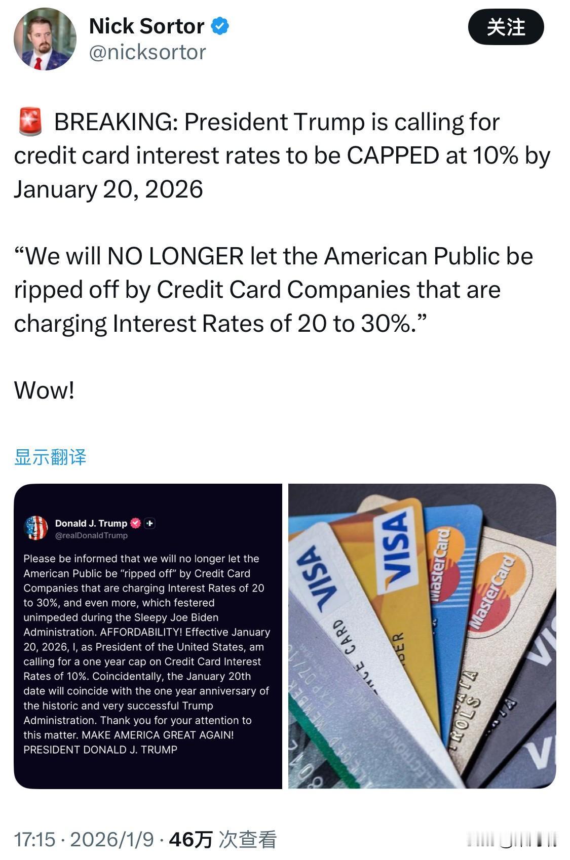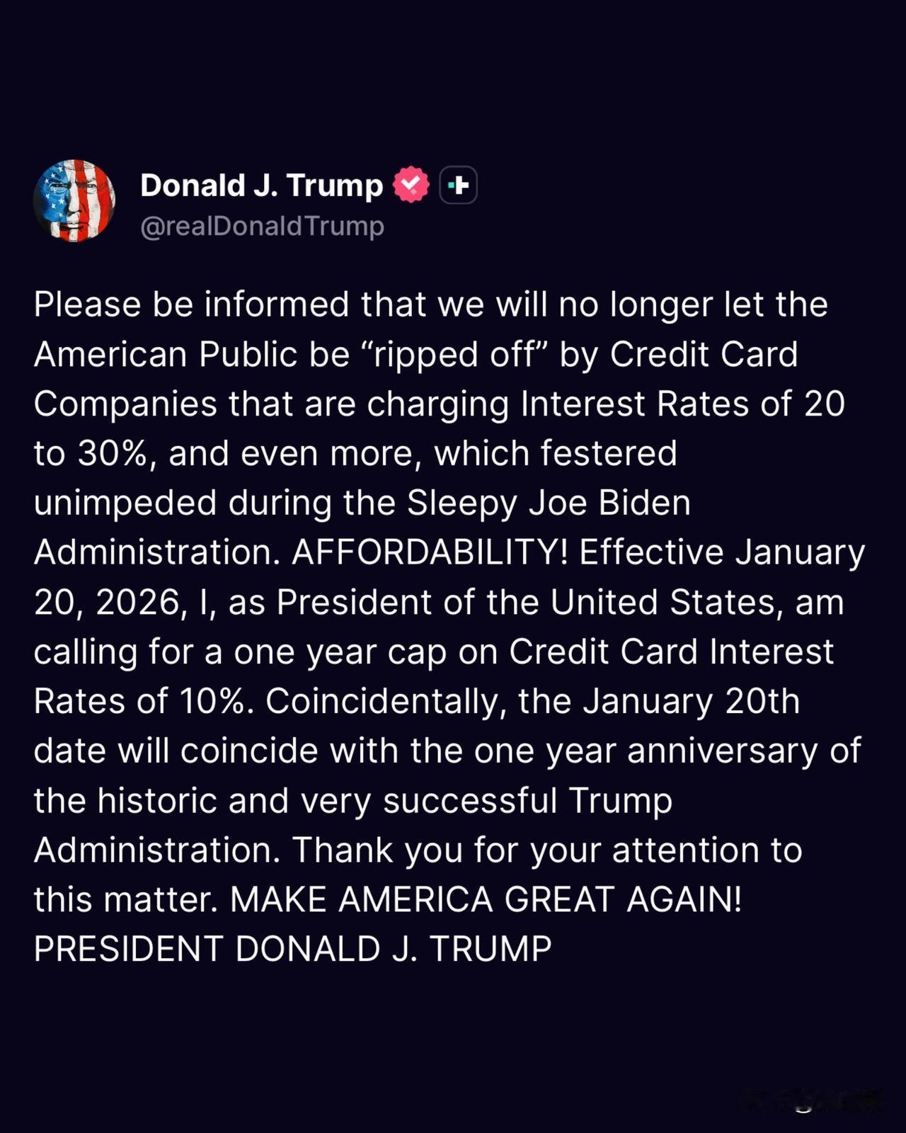 突发新闻:特朗普总统呼吁将信用卡利率上限设定为10%,有效期至2026年1月20日。 “我们绝不再允许美国公众被收取20%至30%利率的信用卡公司敲诈勒索。”