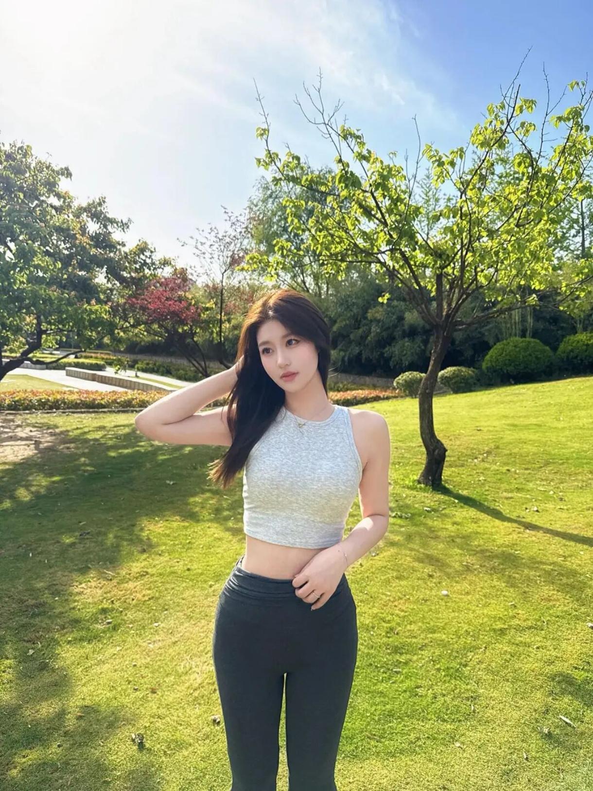 春日里的松弛感 风把草地的软,吹到脚边 阳光筛过新发的树叶 在肩头叠出细碎的光斑 灰色的短款背心裹着轻透的风 露出的腰腹,晃着春日的轻快 黑色的瑜伽裤贴紧腿线 步子迈出去,是没被束缚的舒展 抬手拢了拢头发时 指尖碰到晒暖的发梢 像触到一团温柔的云 身后的树影跟着晃了晃 把职场里攒的紧绷,都揉进草地的绿里 不用端着规整的姿态 不用踩着高跟鞋算着步数 就这么站在春日的风里 让阳光淌过皮肤 让身体跟着风的节奏,轻轻舒展 原来日子慢下来的时候 连呼吸,都裹着青草的甜