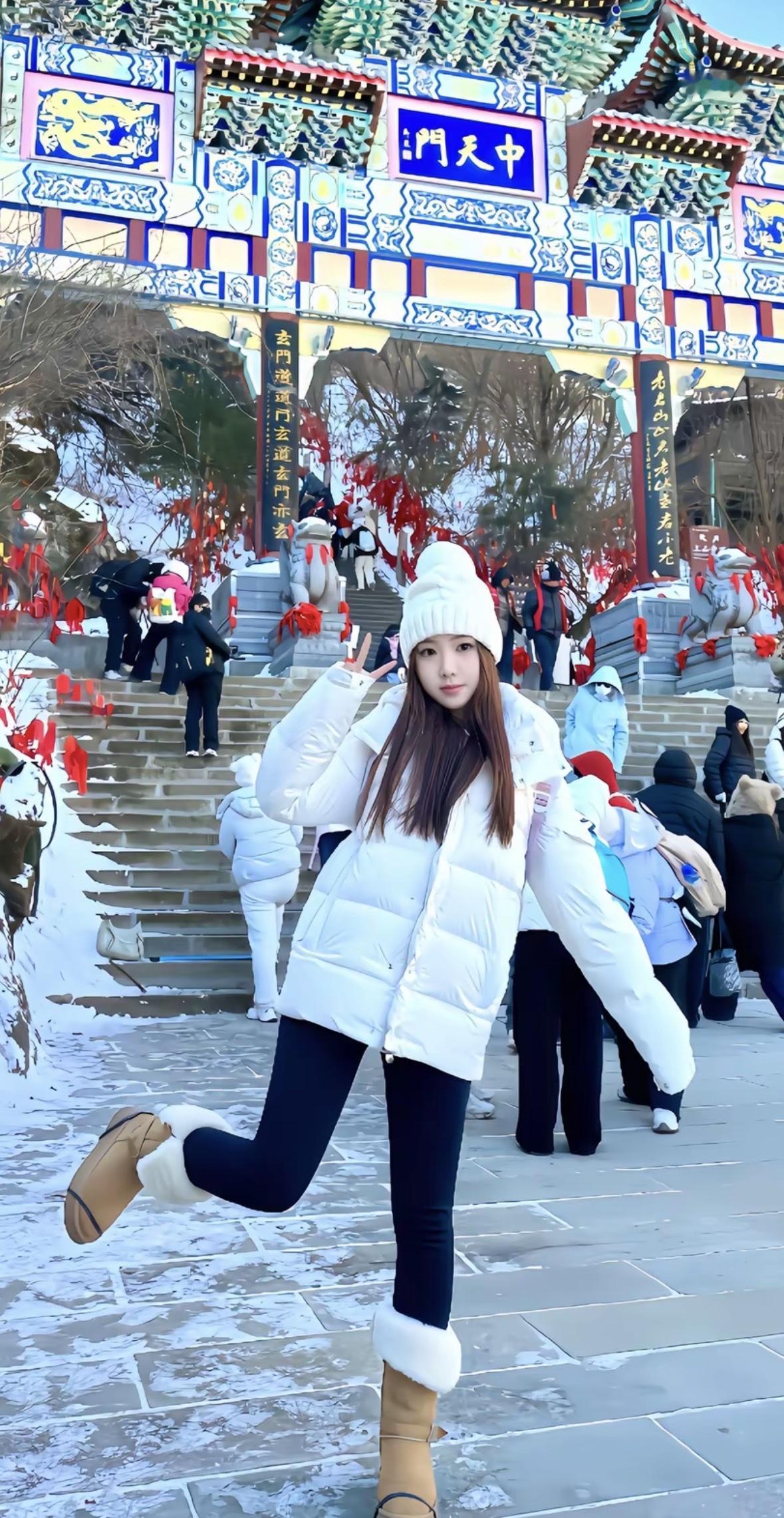 冬日雪景中的少女,俏皮摆拍,红灯笼映衬下的古风建筑,尽显东方韵味。