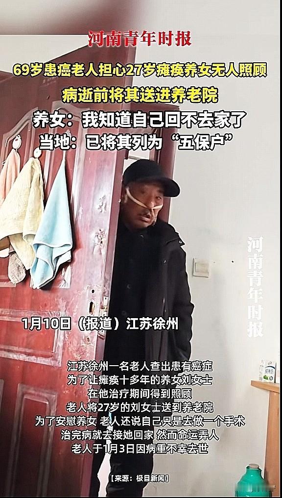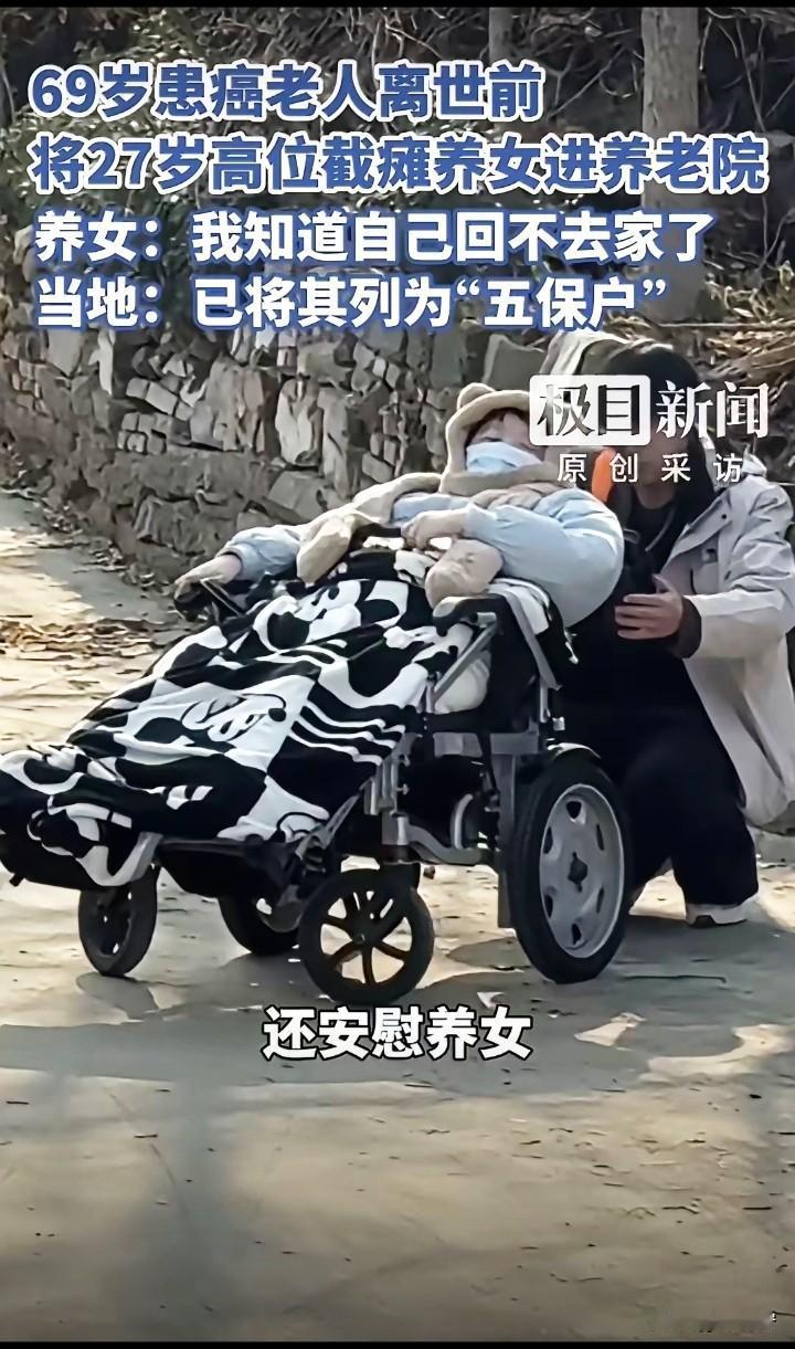 看一次哭一次!徐州69岁癌晚老人,27岁高位截瘫养女,把这份“父爱”刻进了骨子里。 女孩十年前车祸瘫了,刘大爷当爹又当妈,自己省吃俭用,捡旧衣服穿,却给闺女买新电脑、装空调,把她的房间收拾得妥妥帖帖。 去年大爷查出来癌症晚期,他没顾着自己,满脑子都是“我走了,闺女谁管?” 于是瞒着病情,把女孩送进养老院,骗她说“爸去做手术,很快接你回家”。 可这一去,就再也没回来。 女孩知道真相后直接崩溃到绝食,在视频里哭着说:“我知道,自己再也回不去那个家了。” 好在后来当地给她办了五保户,养老院免了费用,残联也安排了心理辅导,总算是有个着落。 只是那个护了她十年的老父亲,终究还是食言了。那句“很快接你回家”,成了老人这辈子最后一个谎言。 麻绳专挑细处断,可人间也有温情在,希望这姑娘往后的路,能少点难。 看完真的破防了,父爱从来都是默默无闻的付出。你们身边有这样不善言辞,却把爱做到极致的长辈吗? 父爱