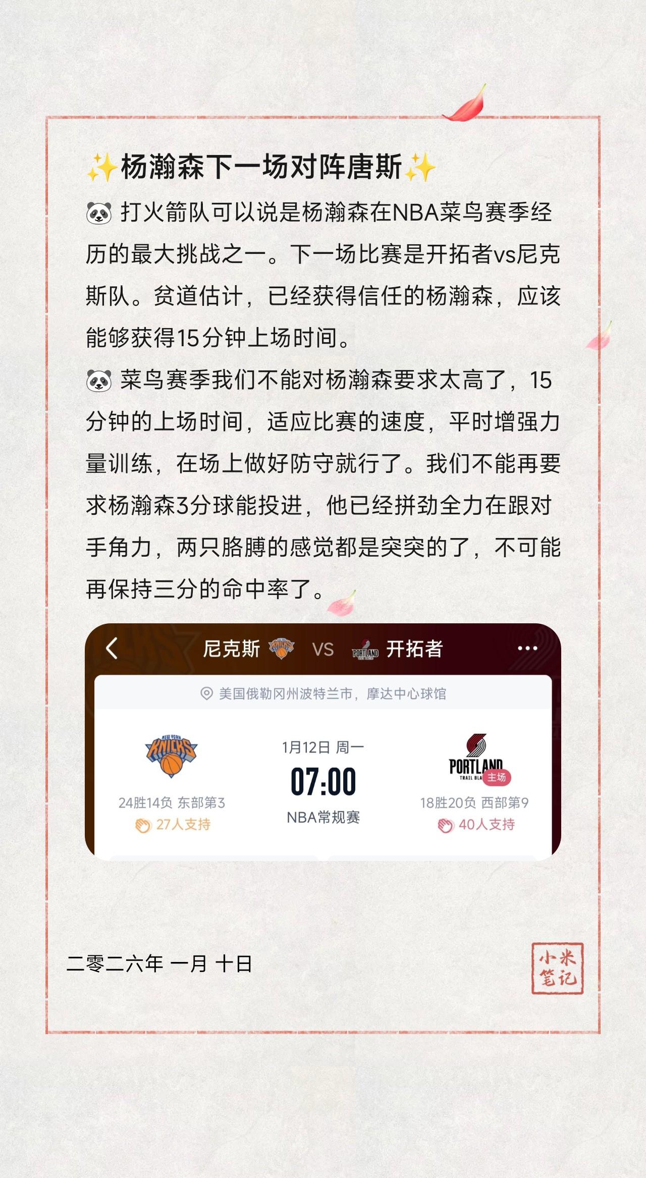 🐼 打火箭队可以说是杨瀚森在NBA菜鸟赛季经历的最大挑战之一。下一场比赛是开拓者vs尼克斯队。贫道估计,已经获得信任的杨瀚森,应该能够获得15分钟上场时间。 🐼 菜鸟赛季我们不能对杨瀚森要求太高了,15分钟的上场时间,适应比赛的速度,平时增强力量训练,在场上做好防守就行了。我们不能再要求杨瀚森3分球能投进,他已经拼劲全力在跟对手角力,两只胳膊的感觉都是突突的了,不可能再保持三分的命中率了。 🐼 跟海王对抗了两场之后,接下来的比赛,杨瀚森可能就适应了与对方中锋的对抗了。他现在还是积累NBA赛场经验阶段,人还都没有认全呢。在贫道看来,杨瀚森已经是进步神速了。 🐼 这个赛季还有40多场比赛,等到赛季结束之后,夏天的时候好好练练力量,再打打夏季联赛和国家队的比赛,NBA第二个赛季的时候,你再看他的表现吧,绝对不次于克林根。只有一样,千万别受伤! 作者:龙须面🧐