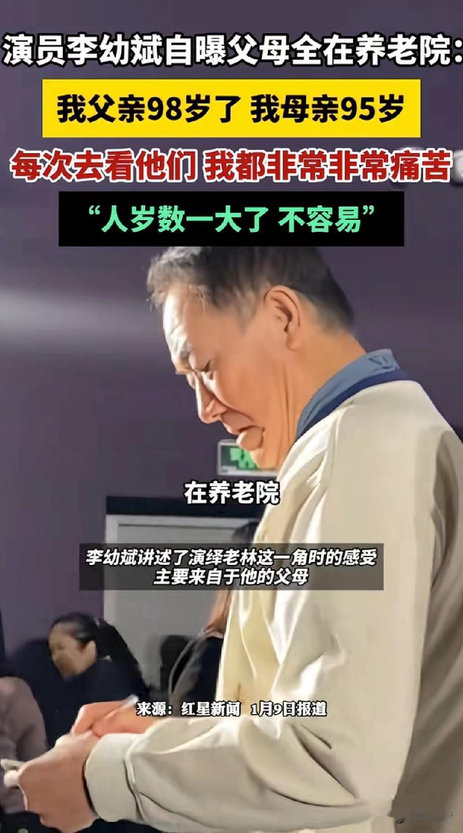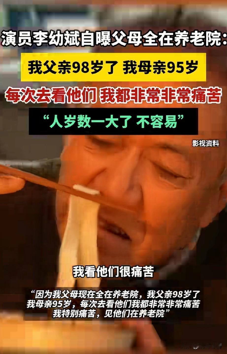 李幼斌在电影宣传现场, 突然爆料自己的父母都还活着, 不过都被他送去了养老院, 他的父亲98了,他的母亲95了, 不过都被他送去了养老院, 每次去养老院看他们都非常痛苦, 还说人岁数一大了,不容易! 他演电影《马腾你别走》演马林这一脸色的感受都来自父母, 这让很多网友觉得他很不孝顺, 之前不知道, 这次被他爆了出来, 他的口碑直线下降, 大家都指责他很不孝顺, 作为老戏骨的李幼斌, 出了很多脍炙人口的电视剧和电影, 钱也挣了,非常的多, 居然将自己的父母送去了养老院, 估计他的父母也没有想到, 自己老年的时候被儿子送去养老院 明明有那么好的那房子, 还有保姆伺候, 居然将自己的父母送去养老院, 怪不得网友都觉得他这人很不孝顺, 在中国,百善孝为先, 不管是明星,大老板还是官员, 在自己父母的面前都是孩子, 年轻的时候,父母为他们奉献了所有, 普通人没办法,才把父母养到养老院, 明星明明那么有钱, 时间也比较闲, 居然不请保姆照顾父母, 还把自己的父母送到养老院, 确实让人看不下去了, 大家觉得李有斌将自己的父母送到养老院是不是不孝顺? 李幼斌
