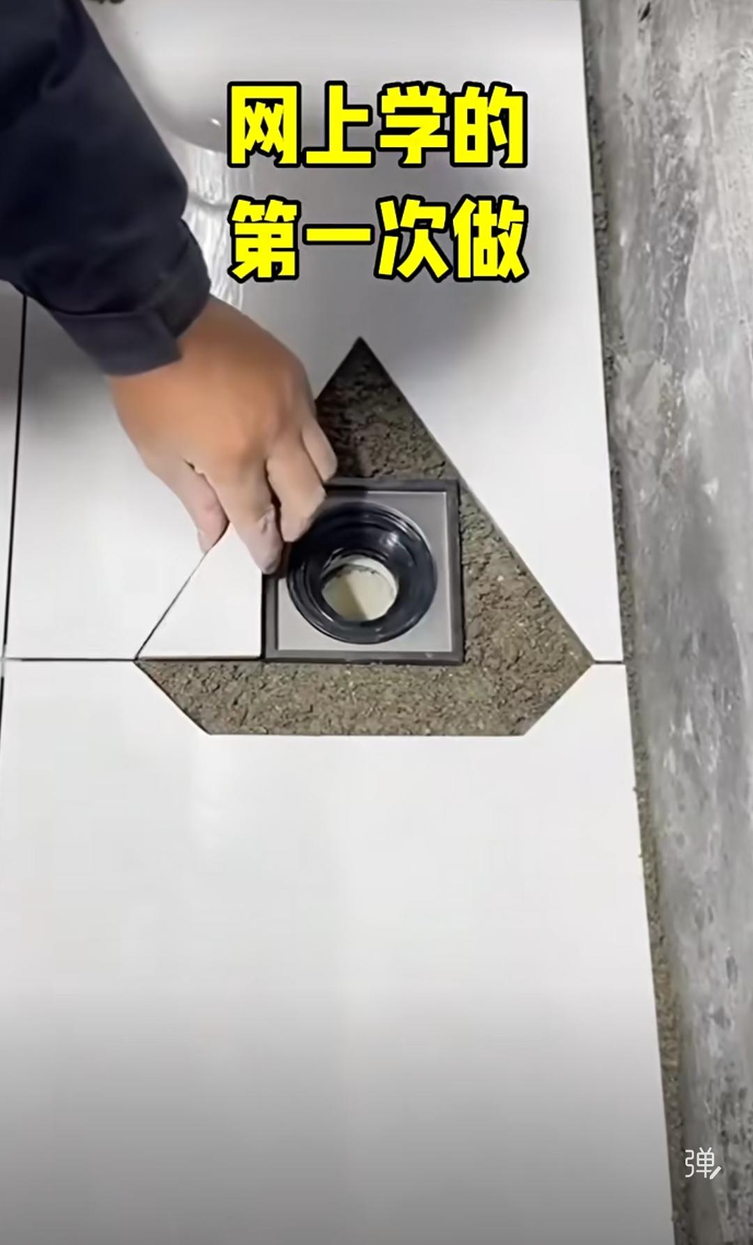 这位师傅真厉害!头一回照着网上学来的地漏做法操作,就完成得如此出色,一个地漏宛如镶嵌在宝石之中。 看来,只要用心,即便只有一个视频画面,师傅也能学到其中的精髓,甚至比原创者做得更出色。就说画面里这位师傅,在地面瓷砖上切出的宝石型地漏,着实让人百看不厌。 大家说,这样的地漏造型是不是很美观? 地漏造型