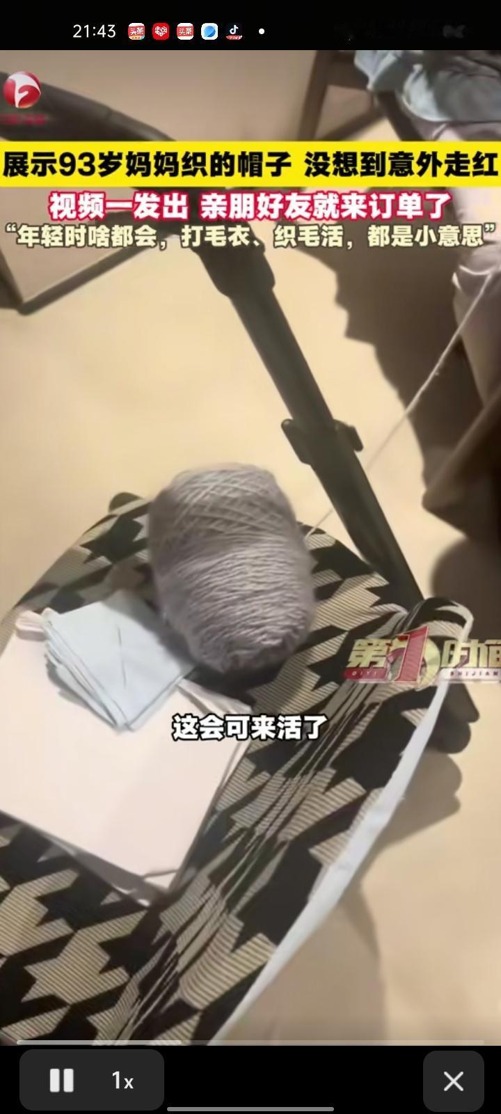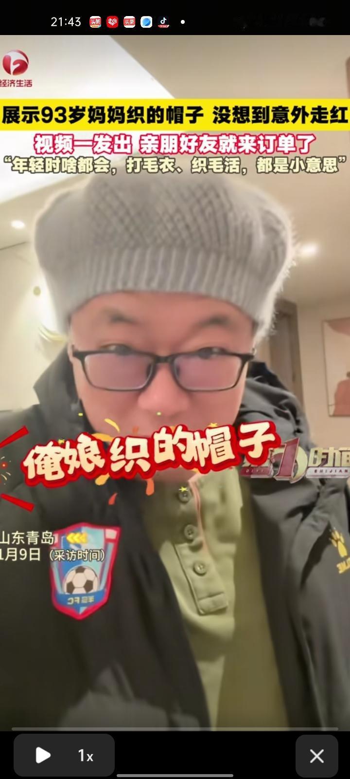 1月8日,山东青岛。小伙展示了93岁妈妈织的帽子,堪称艺术家级别。视频一发出,亲朋好友就来订单了。 当事人表示,感觉妈妈没有什么不会的东西,她自己能打吊铺,用砖头什么的盘锅台,打毛衣、织线活都是小意思。