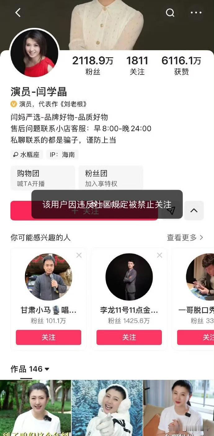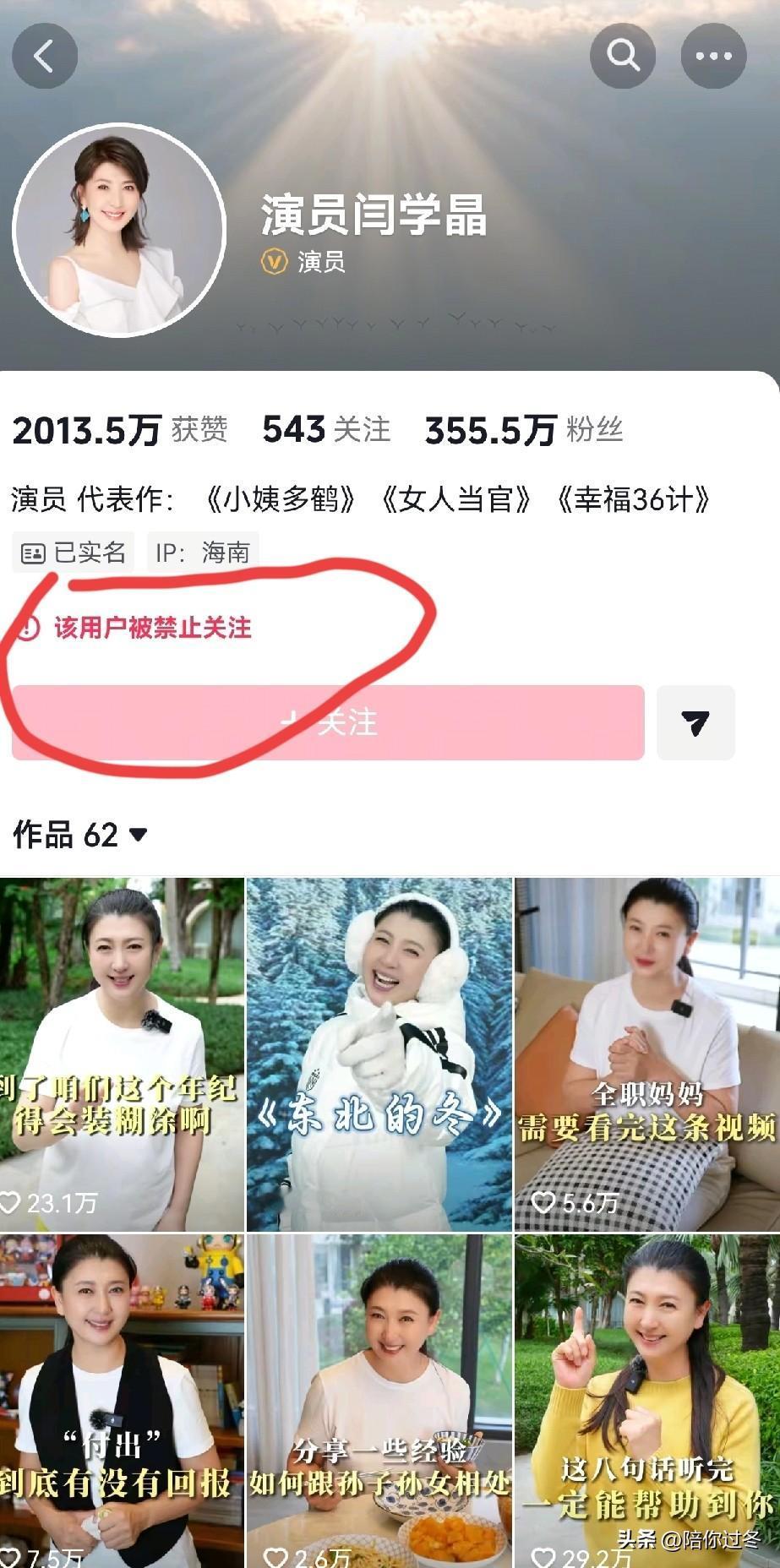 闫学晶多个账号被“禁止关注”[笑哭] 来喽、来喽,著名演员闫学晶终于“塌房”了,此前在网上各种卖惨,和网友互怼,调侃网友是“酸黄瓜”现在嘚瑟不起来了! 身为军队文职三级(正师级)干部、国家一级演员,却公然蔑视农民群体,声称“老农民就老老实实种地,一年随便一二十万,你穷就是因为懒”的言论引发热议。 另一边却为自己儿子哭穷,称儿子一部戏片酬才几十万,一年没一百万根本不够花。如此割裂的价值观,完全没有公众人物的样子。 1月10日,网友搜索发现,演员闫学晶的抖音、快手等平台账号被禁止关注了,官方给出的解释是“该用户违反了社区规定”,可能是因为负面影响太大吧![笑哭] 真替闫学晶老师担心呀,娱乐圈已经不好混了如果不能直播卖货,那岂不是雪上加霜吗?[捂脸] 记得,前两天演员孙涛直播还出来替闫学晶打抱不平的,不知道他现在还有没有这个勇气出来叫嚣呢?闫家晶